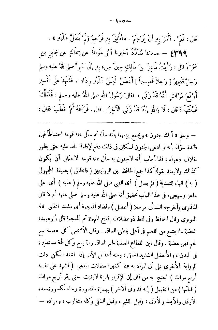 وَسَلَّمَ " أَبِكَ جُنُون " وَيُجْمَع بَيْنهمَا بِأَنَّهُ سَأَلَهُ ثُمَّ سَأَلَ عَنْهُ قَوْمه اِحْتِيَاطًا فَإِنَّ فَائِدَة سُؤَاله أَنَّهُ لَوْ اِدَّعَى الْجُنُون لَكَانَ فِي ذَلِكَ دَفْع لِإِقَامَةِ الْحَدّ عَلَيْهِ حَتَّى يَظْهَر خِلَاف دَعْوَاهُ ، فَلَمَّا أَجَابَ بِأَنَّهُ لَا جُنُون بِهِ سَأَلَ عَنْهُ قَوْمه لِاحْتِمَالِ أَنْ يَكُون كَذَلِكَ وَلَا يَعْتَدّ بِقَوْلِهِ كَذَا جَمَعَ الْحَافِظ بَيْن الرِّوَايَتَيْنِ