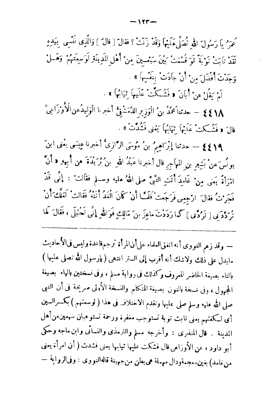 قَالَ الْمُنْذِرِيّ : وَأَخْرَجَهُ مُسْلِم وَالتِّرْمِذِيّ وَالنَّسَائِيُّ وَابْن مَاجَهْ وَحَكَى أَبُو دَاوُدَ ، عَنْ الْأَوْزَاعِيّ قَالَ فَشُكَّتْ عَلَيْهَا ثِيَابهَا يَعْنِي فَشُدَّتْ .
