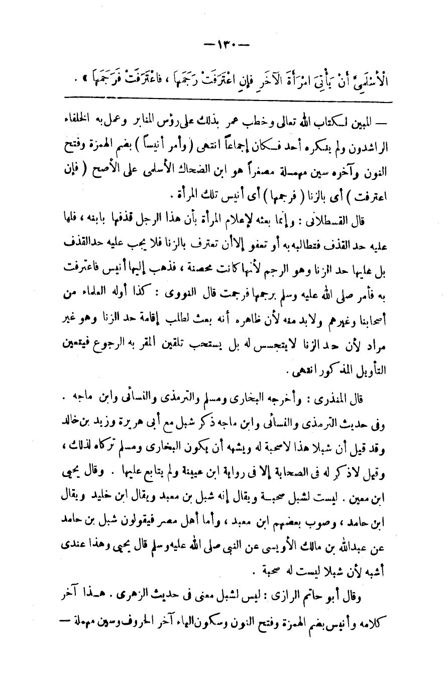 وَقَالَ أَبُو حَاتِم الرَّازِيّ : لَيْسَ لِشِبْلٍ مَعْنًى فِي حَدِيث الزُّهْرِيّ . هَذَا آخِر كَلَامه وَأُنَيْس بِضَمِّ الْهَمْزَة وَفَتْح النُّون وَسُكُون الْيَاء آخِر الْخَرُوف وَسِين مُهْمَلَة@