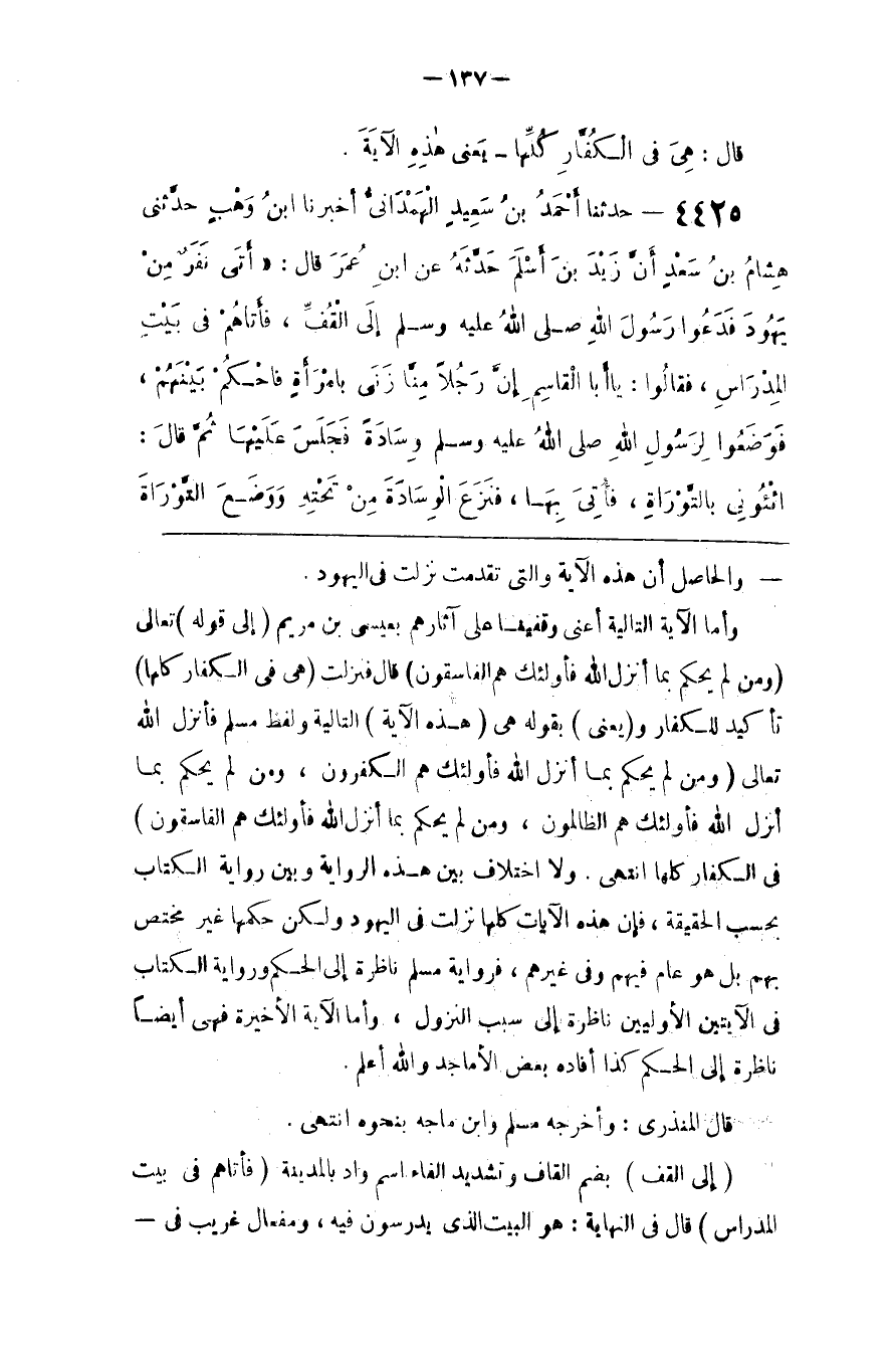 : التَّالِيَة وَلَفْظ مُسْلِم فَأَنْزَلَ اللَّه تَعَالَى { وَمَنْ لَمْ يَحْكُم بِمَا أَنْزَلَ اللَّه فَأُولَئِكَ هُمْ الْكَافِرُونَ . وَمَنْ لَمْ يَحْكُم بِمَا أَنْزَلَ اللَّه فَأُولَئِكَ هُمْ الظَّالِمُونَ . وَمَنْ لَمْ يَحْكُم بِمَا أَنْزَلَ اللَّه فَأُولَئِكَ هُمْ الْفَاسِقُونَ } : فِي الْكُفَّار كُلّهَا اِنْتَهَى . وَلَا اِخْتِلَاف بَيْن هَذِهِ الرِّوَايَة وَبَيْن رِوَايَة الْكِتَاب بِحَسَبِ الْحَقِيقَة ، فَإِنَّ هَذِهِ الْآيَات كُلّهَا نَزَلَتْ فِي الْيَهُود وَلَكِنَّ حُكْمهَا غَيْر مُخْتَصّ بِهِمْ بَلْ هُوَ عَامّ فِيهِمْ وَفِي غَيْرهمْ ، فَرِوَايَة مُسْلِم نَاظِرَة إِلَى الْحُكْم وَرِوَايَة الْكِتَاب فِي الْآيَتَيْنِ الْأُولَيَيْنِ نَاظِرَة إِلَى سَبَب النُّزُول ، وَأَمَّا الْآيَة الْأَخِيرَة فَهِيَ أَيْضًا نَاظِرَة إِلَى الْحُكْم كَذَا أَفَادَهُ بَعْض الْأَمَاجِد وَاَللَّه أَعْلَم .