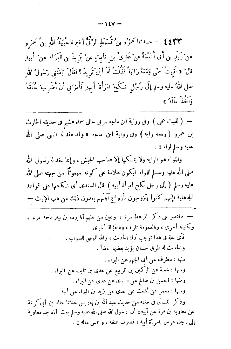 وذكر النسائي في سننه من حديث عبد الله بن إدريس حدثنا خالد بن أبي كريمة عن معاوية بن قرة عن أبيه أن رسول الله صلى الله عليه و سلم بعث أباه جد معاوية إلى رجل عرس بامرأة أبيه فضرب عنقه وخمس ماله