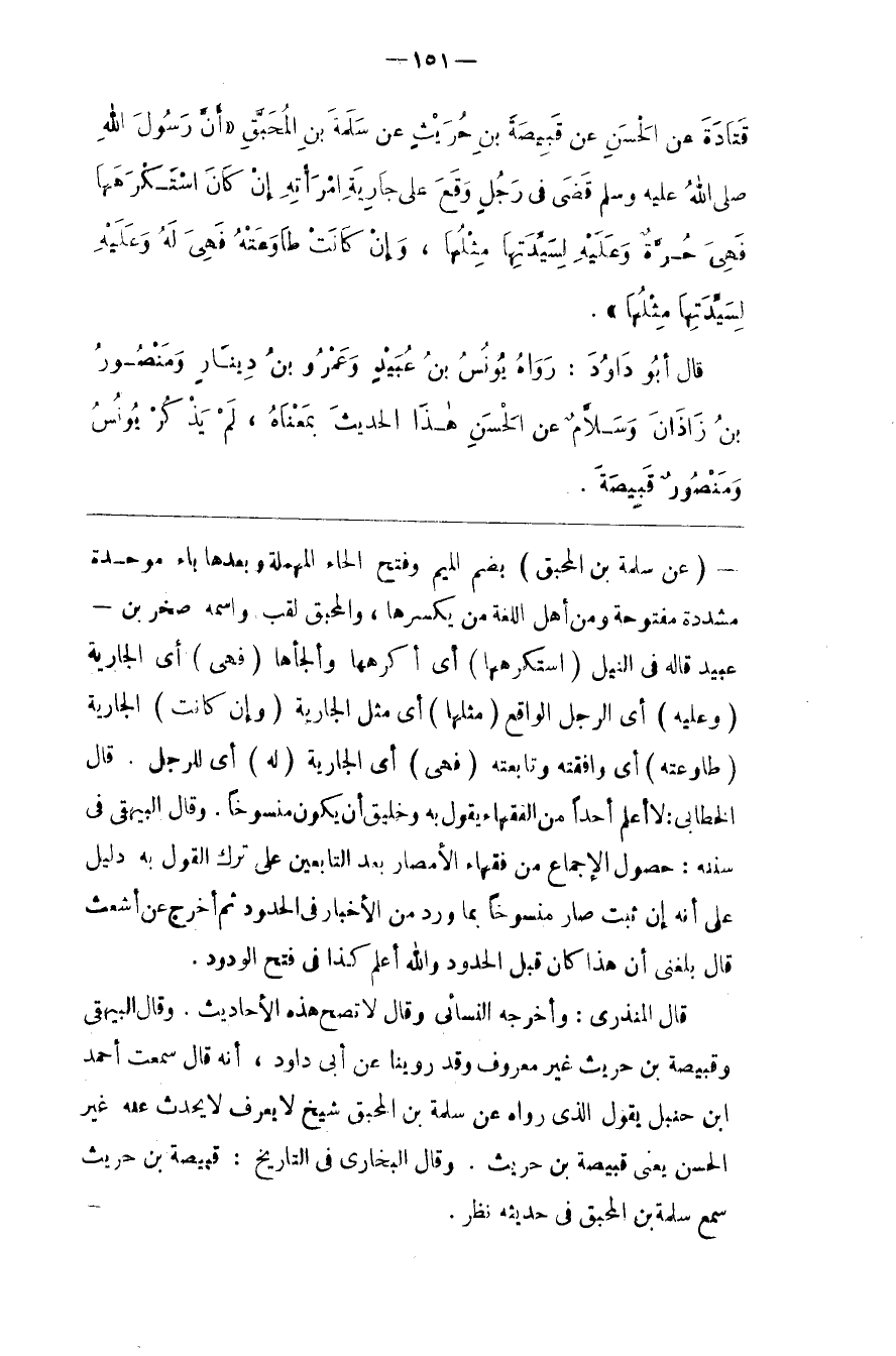 قَالَ الْمُنْذِرِيّ : وَأَخْرَجَهُ النَّسَائِيُّ وَقَالَ لَا تَصِحّ هَذِهِ الْأَحَادِيث . وَقَالَ الْبَيْهَقِيُّ وَقَبِيصَة بْنُ حُرَيْث غَيْر مَعْرُوف وَقَدْ رُوِّينَا عَنْ أَبِي دَاوُدَ ، أَنَّهُ قَالَ سَمِعْت أَحْمَد بْن حَنْبَل يَقُول الَّذِي رَوَاهُ عَنْ سَلَمَة بْن الْمُحَبَّق شَيْخ لَا يُعْرَف لَا يُحَدِّث عَنْهُ غَيْر الْحَسَن يَعْنِي قَبِيصَة بْن حُرَيْث .