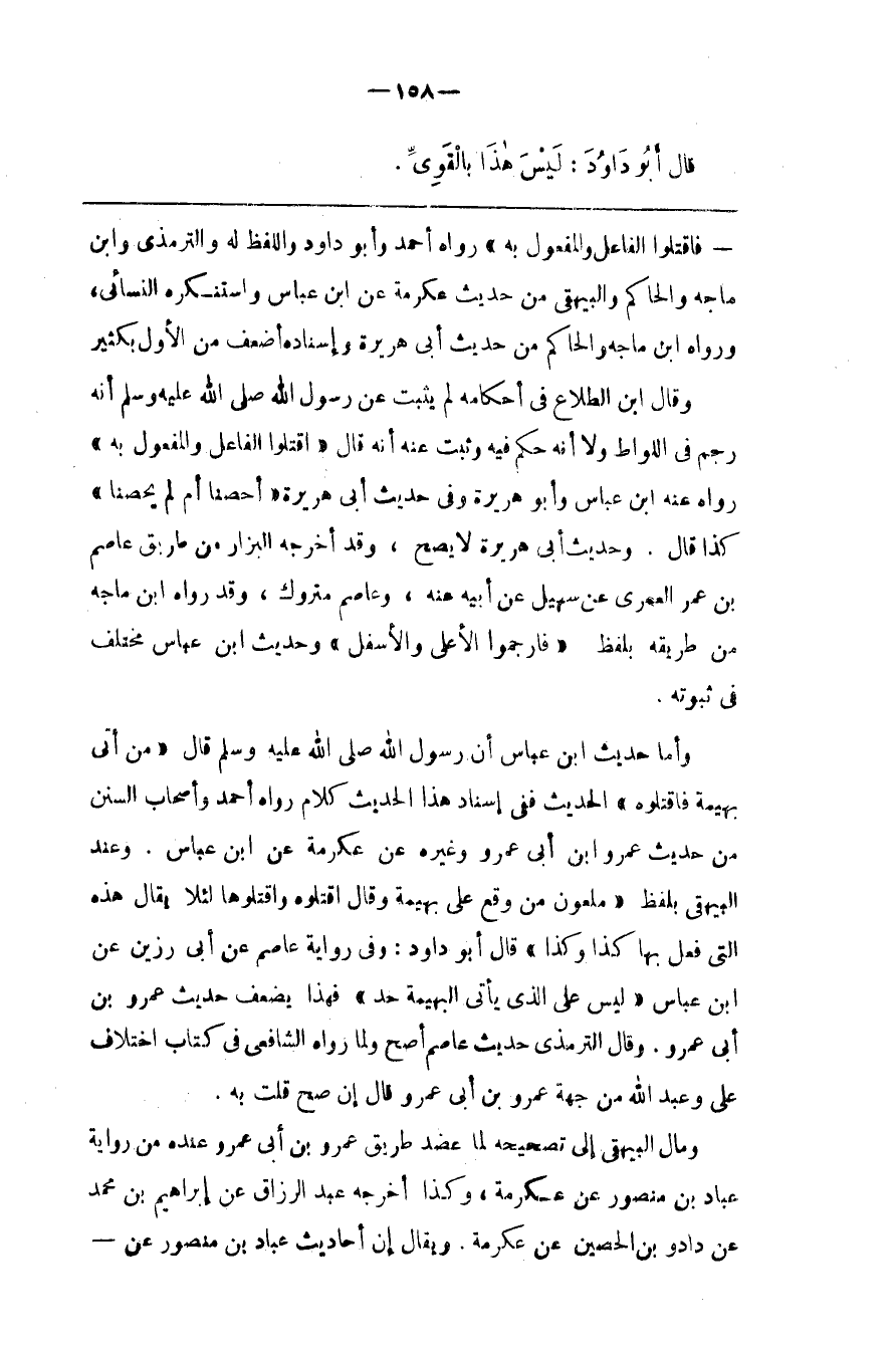 وَأَمَّا حَدِيث اِبْن عَبَّاس أَنَّ رَسُول اللَّه صَلَّى اللَّه عَلَيْهِ وَسَلَّمَ قَالَ : " مَنْ أَتَى بَهِيمَة فَاقْتُلُوهُ " الْحَدِيث فَفِي إِسْنَاد هَذَا الْحَدِيث كَلَام رَوَاهُ أَحْمَد وَأَصْحَاب السُّنَن مِنْ حَدِيث عَمْرو بْن أَبِي عَمْرو وَغَيْره عَنْ عِكْرِمَة عَنْ اِبْن عَبَّاس . وَعِنْد الْبَيْهَقِيِّ بِلَفْظِ " مَلْعُون مَنْ وَقَعَ عَلَى بَهِيمَة " وَقَالَ " اُقْتُلُوهُ وَاقْتُلُوهَا لِئَلَّا يُقَال هَذِهِ الَّتِي فُعِلَ بِهَا كَذَا وَكَذَا " .