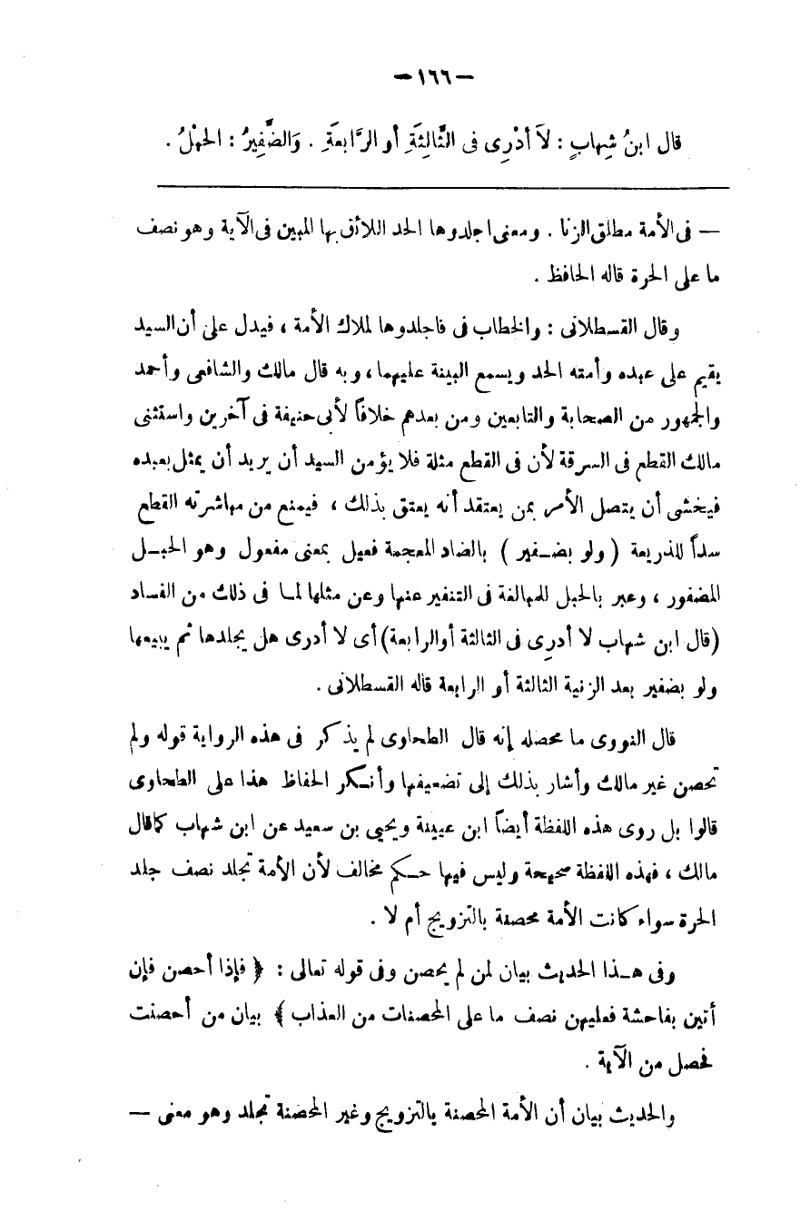 وَقَالَ الْقَسْطَلَّانِيّ : وَالْخِطَاب فِي فَاجْلِدُوهَا لِمُلَّاكِ الْأَمَة ، فَيَدُلّ عَلَى أَنَّ السَّيِّد يُقِيم عَلَى عَبْده وَأَمَته الْحَدّ وَيَسْمَع الْبَيِّنَة عَلَيْهِمَا ، وَبِهِ قَالَ مَالِك وَالشَّافِعِيّ وَأَحْمَد وَالْجُمْهُور مِنْ الصَّحَابَة وَالتَّابِعِينَ وَمَنْ بَعْدهمْ خِلَافًا لِأَبِي حَنِيفَة فِي آخَرِينَ وَاسْتَثْنَى مَالِك الْقَطْع فِي السَّرِقَة لِأَنَّ فِي الْقَطْع مُثْلَة فَلَا يُؤْمَن السَّيِّد أَنْ يُرِيد أَنْ يُمَثِّل بِعَبْدِهِ فَيُخْشَى أَنْ يَتَّصِل الْأَمْر بِمَنْ يَعْتَقِد أَنَّهُ يَعْتِق بِذَلِكَ ، فَيُمْنَع مِنْ مُبَاشَرَته الْقَطْع سَدًّا لِلذَّرِيعَةِ