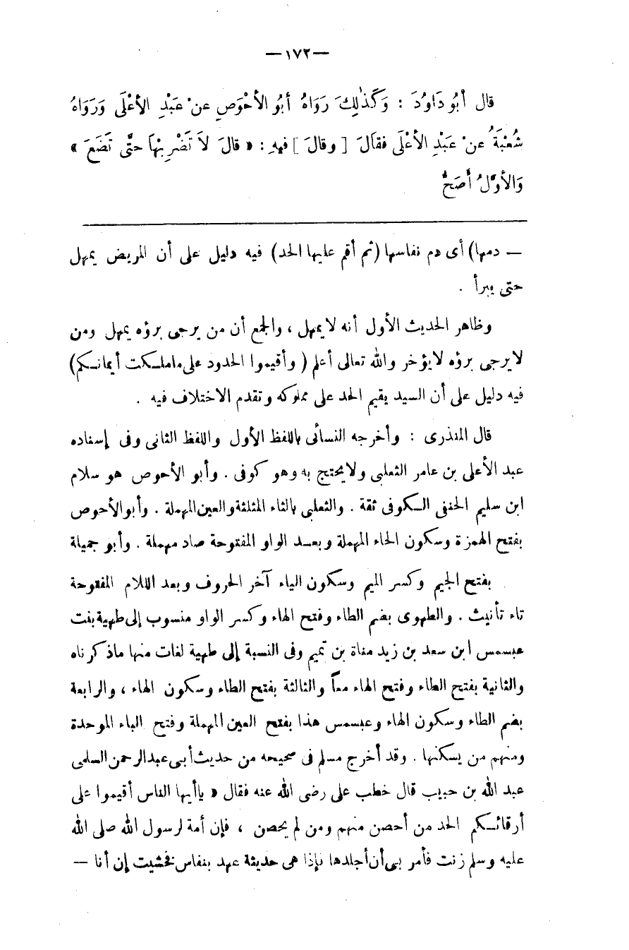 قَالَ الْمُنْذِرِيّ : وَأَخْرَجَهُ النَّسَائِيُّ بِاللَّفْظِ الْأَوَّل وَاللَّفْظ الثَّانِي وَفِي إِسْنَاده عَبْد الْأَعْلَى بْن عَامِر الثَّعْلَبِيّ وَلَا يُحْتَجّ بِهِ وَهُوَ كُوفِيّ . وَأَبُو الْأَحْوَص هُوَ سَلَام بْن سُلَيْمٍ الْحَنَفِيّ الْكُوفِيّ ثِقَة . وَالثَّعْلَبِيّ بِالثَّاءِ الْمُثَلَّثَة وَالْعَيْن الْمُهْمَلَة . وَأَبُو الْأَحْوَص بِفَتْحِ الْهَمْزَة وَسُكُون الْحَاء الْمُهْمَلَة وَبَعْد الْوَاو الْمَفْتُوحَة صَاد مُهْمَلَة . وَأَبُو جَمِيلَة بِفَتْحِ الْجِيم وَكَسْر الْمِيم وَسُكُون الْيَاء آخِر الْحُرُوف وَبَعْد اللَّام الْمَفْتُوحَة تَاء تَأْنِيث . وَالطُّهَوِيّ بِضَمِّ الطَّاء وَفَتْح الْهَاء وَكَسْر الْوَاو مَنْسُوب إِلَى طُهَيَّة بِنْت عَبْد شَمْس بْن سَعْد بْن زَيْد مَنَاة بْن تَمِيم وَفِي النِّسْبَة إِلَى طُهَيَّة لُغَات مِنْهَا مَا ذَكَرْنَاهُ وَالثَّانِيَة بِفَتْحِ الطَّاء وَفَتْح الْهَاء مَعًا وَالثَّالِثَة بِفَتْحِ الطَّاء وَسُكُون الْهَاء ، وَالرَّابِعَة بِضَمِّ الطَّاء وَسُكُون الْهَاء وَعَبْد شَمْس هَذَا بِفَتْحِ الْعَيْن الْمُهْمَلَة وَفَتْح الْبَاء الْمُوَحَّدَة وَمِنْهُمْ مَنْ يُسَكِّنهَا . وَقَدْ أَخْرَجَ مُسْلِم فِي صَحِيحه مِنْ حَدِيث أَبِي عَبْد الرَّحْمَن السُّلَمِيّ عَبْد اللَّه بْن حَبِيب قَالَ خَطَبَ عَلِيّ رَضِيَ اللَّه عَنْهُ فَقَالَ : " يَا أَيّهَا النَّاس أَقِيمُوا عَلَى أَرِقَّائِكُمْ الْحَدّ مَنْ أَحْصَنَ مِنْهُمْ وَمَنْ لَمْ يُحْصِنْ ، فَإِنَّ أَمَة لِرَسُولِ اللَّه صَلَّى اللَّه عَلَيْهِ وَسَلَّمَ زَنَتْ فَأَمَرَ بِي أَنْ أَجْلِدهَا فَإِذَا هِيَ حَدِيثَة عَهْد بِنِفَاسٍ فَخَشِيت إِنْ أَنَا@