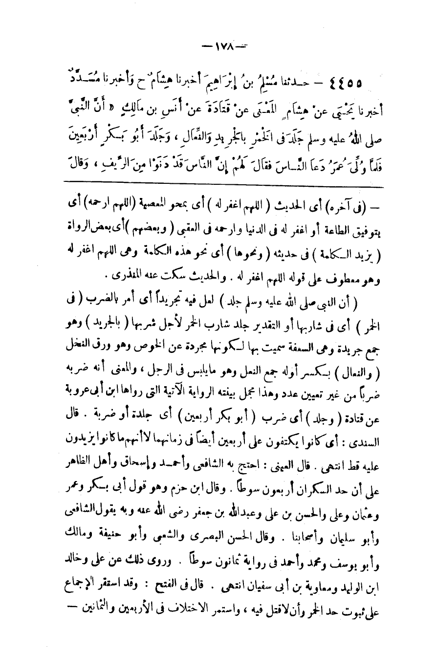 : أَيْ جَلْدَة أَوْ ضَرْبَة . قَالَ السِّنْدِيُّ : أَيْ كَانُوا يَكْتَفُونَ عَلَى أَرْبَعِينَ أَيْضًا فِي زَمَانهمَا إِلَّا أَنَّهُمْ مَا كَانُوا يَزِيدُونَ عَلَيْهِ قَطُّ اِنْتَهَى . قَالَ الْعَيْنِيّ : اِحْتَجَّ بِهِ الشَّافِعِيّ وَأَحْمَد وَإِسْحَاق وَأَهْل الظَّاهِر عَلَى أَنَّ حَدّ السَّكْرَان أَرْبَعُونَ سَوْطًا . وَقَالَ اِبْن حَزْم وَهُوَ قَوْل أَبِي بَكْر وَعُمَر وَعُثْمَان وَعَلِيّ وَالْحَسَن بْن عَلِيّ وَعَبْد اللَّه بْن جَعْفَر رَضِيَ اللَّه عَنْهُ وَبِهِ يَقُول الشَّافِعِيّ وَأَبُو سُلَيْمَان وَأَصْحَابنَا . وَقَالَ الْحَسَن الْبَصْرِيّ وَالشَّعْبِيّ وَأَبُو حَنِيفَة وَمَالِك وَأَبُو يُوسُف وَمُحَمَّد وَأَحْمَد فِي رِوَايَة ثَمَانُونَ سَوْطًا . وَرُوِيَ ذَلِكَ عَنْ عَلِيّ وَخَالِد بْن الْوَلِيد وَمُعَاوِيَة بْن أَبِي سُفْيَان اِنْتَهَى . قَالَ فِي الْفَتْح : وَقَدْ اِسْتَقَرَّ الْإِجْمَاع عَلَى ثُبُوت حَدّ الْخَمْر وَأَنْ لَا قَتْل فِيهِ ، وَاسْتَمَرَّ الِاخْتِلَاف فِي الْأَرْبَعِينَ وَالثَّمَانِينَ @