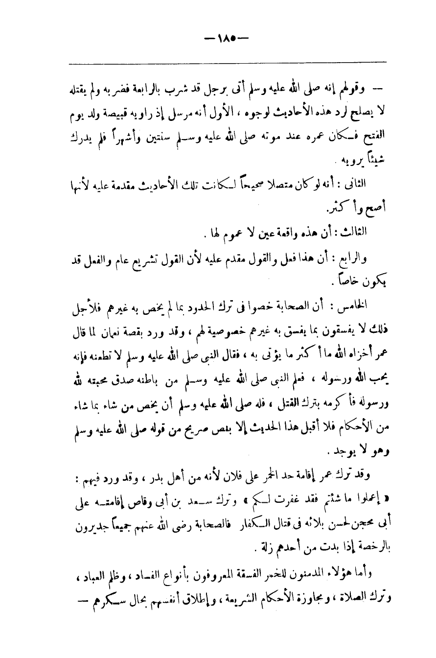 وَقَوْلهمْ إِنَّهُ صَلَّى اللَّه عَلَيْهِ وَسَلَّمَ أُتِيَ بِرَجُلٍ قَدْ شَرِبَ بِالرَّابِعَةِ فَضَرَبَهُ وَلَمْ يَقْتُلهُ لَا يَصْلُح لِرَدِّ هَذِهِ الْأَحَادِيث لِوُجُوهٍ ، الْأَوَّل أَنَّهُ مُرْسَل إِذْ رَاوِيه قَبِيصَة وُلِدَ يَوْم الْفَتْح فَكَانَ عُمْره عِنْد مَوْته صَلَّى اللَّه عَلَيْهِ وَسَلَّمَ سَنَتَيْنِ وَأَشْهُرًا فَلَمْ يُدْرِك شَيْئًا يَرْوِيه .