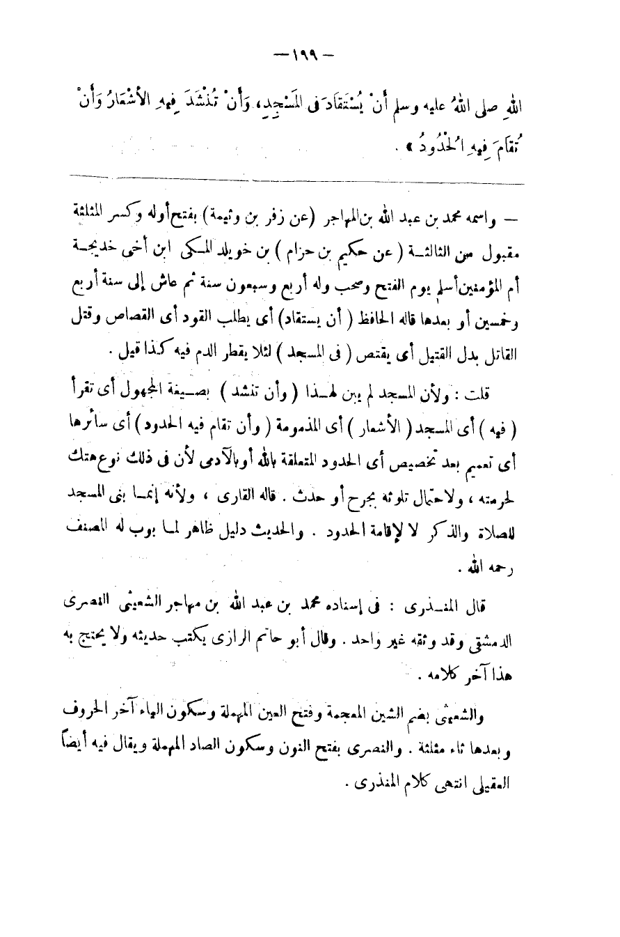 : أَيْ سَائِرهَا أَيْ تَعْمِيم بَعْد تَخْصِيص أَيْ الْحُدُود الْمُتَعَلِّقَة بِاَللَّهِ أَوْ بِالْآدَمِيِّ لِأَنَّ فِي ذَلِكَ نَوْع هَتْك لِحُرْمَتِهِ ، وَلِاحْتِمَالِ تَلَوُّثه بِجُرْحٍ أَوْ حَدَث . قَالَهُ الْقَارِي ؛ وَلِأَنَّهُ إِنَّمَا بُنِيَ الْمَسْجِد لِلصَّلَاةِ وَالذِّكْر لَا لِإِقَامَةِ الْحُدُود . وَالْحَدِيث دَلِيل ظَاهِر لِمَا بَوَّبَ لَهُ الْمُصَنِّف رَحِمَهُ اللَّه .