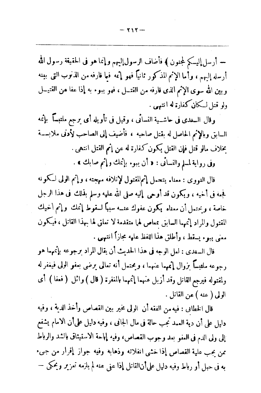 أُرْسِلَ إِلَيْكُمْ لَمَجْنُونٌ } فَأَضَافَ الرَّسُول إِلَيْهِمْ وَإِنَّمَا هُوَ فِي الْحَقِيقَة رَسُول اللَّه صَلَّى اللَّه عَلَيْهِ وَسَلَّمَ أَرْسَلَهُ إِلَيْهِمْ ، وَأَمَّا الْإِثْم الْمَذْكُور ثَانِيًا فَهُوَ إِثْمه فِيمَا قَارَفَهُ مِنْ الذُّنُوب الَّتِي بَيْنه وَبَيْن اللَّه سِوَى الْإِثْم الَّذِي قَارَفَهُ مِنْ الْقَتْل ، فَهُوَ يَبُوء بِهِ إِذَا عَفَا عَنْ الْقَتِيل وَلَوْ قُتِلَ لَكَانَ كَفَّارَة لَهُ اِنْتَهَى .