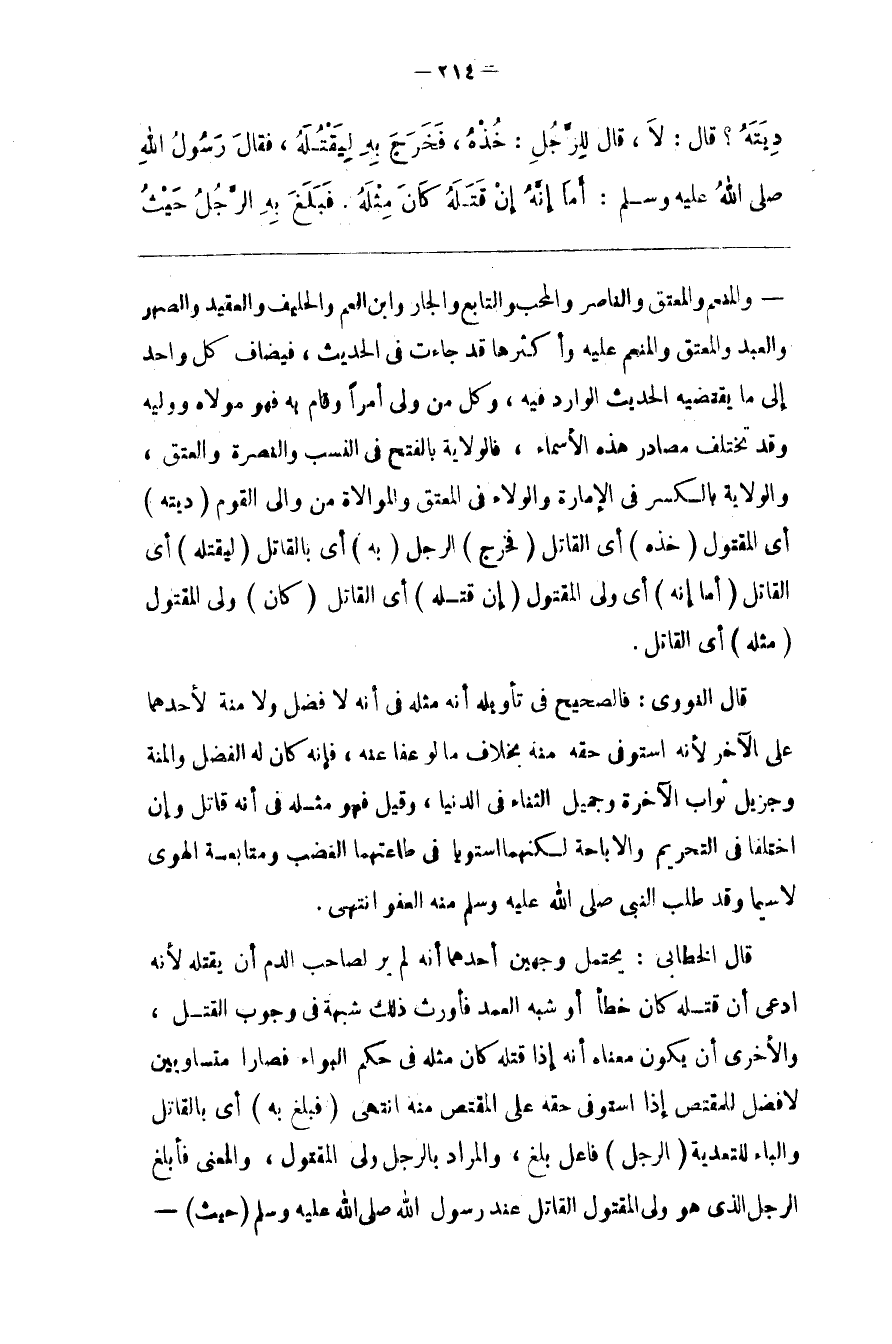 قَالَ الْخَطَّابِيُّ : يَحْتَمِل وَجْهَيْنِ أَحَدهمَا أَنَّهُ لَمْ يَرَ لِصَاحِبِ الدَّم أَنْ يَقْتُلهُ لِأَنَّهُ اِدَّعَى أَنَّ قَتْله كَانَ خَطَأ أَوْ شِبْه الْعَمْد فَأَوْرَثَ ذَلِكَ شُبْهَة فِي وُجُوب الْقَتْل ، وَالْأُخْرَى أَنْ يَكُون مَعْنَاهُ أَنَّهُ إِذَا قَتَلَهُ كَانَ مِثْله فِي حُكْم الْبَوَاء فَصَارَا مُتَسَاوِيَيْنِ لَا فَضْل لِلْمُقْتَصِّ إِذَا اسْتَوْفَى حَقّه عَلَى الْمُقْتَصّ مِنْهُ اِنْتَهَى