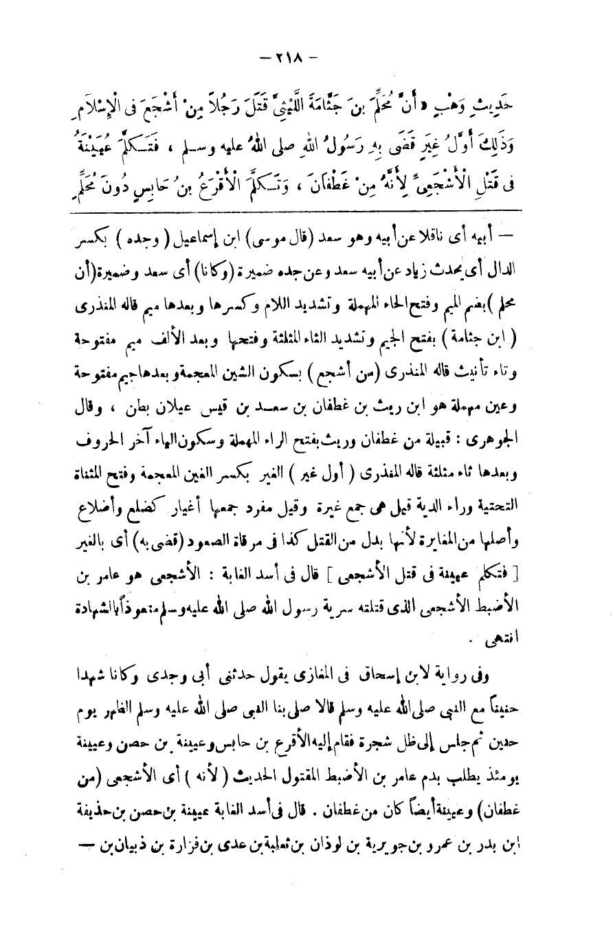 وَفِي رِوَايَة لِابْنِ إِسْحَاق فِي الْمَغَازِي يَقُول حَدَّثَنِي أَبِي وَجَدِّي وَكَانَا شَهِدَا حُنَيْنًا مَعَ النَّبِيّ صَلَّى اللَّه عَلَيْهِ وَسَلَّمَ قَالَا صَلَّى بِنَا النَّبِيّ صَلَّى اللَّه عَلَيْهِ وَسَلَّمَ الظُّهْر يَوْم حُنَيْنٍ ثُمَّ جَلَسَ إِلَى ظِلّ شَجَرَة فَقَامَ إِلَيْهِ الْأَقْرَع بْن حَابِس وَعُيَيْنَة بْن حِصْن وَعُيَيْنَة يَوْمئِذٍ يُطْلَب بِدَمِ عَامِر بْن الْأَضْبَط الْمَقْتُول الْحَدِيث