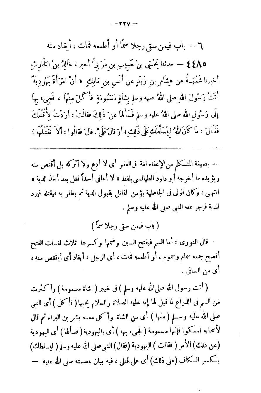 قَالَ النَّوَوِيّ : أَمَّا السَّمّ فَبِفَتْحِ السِّين وَضَمّهَا وَكَسْرهَا ثَلَاث لُغَات الْفَتْح أَفْصَح جَمْعه سِمَام وَسُمُوم ، أَوْ أَطْعَمَهُ فَمَاتَ ، أَيْ الرَّجُل ، أَيُقَادُ أَيْ أَيُقْتَصُّ مِنْهُ ، أَيْ مِنْ السَّاقِي .