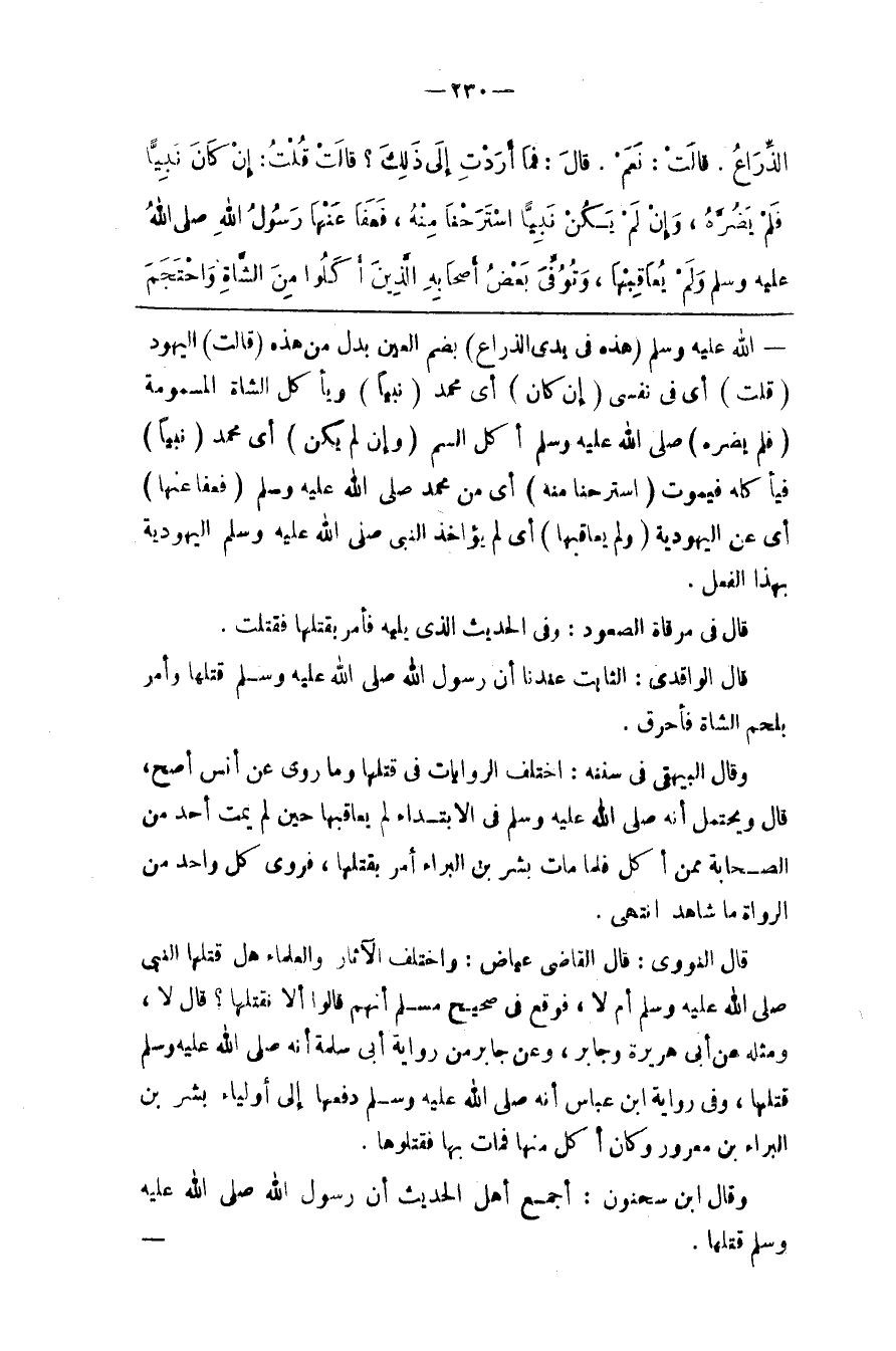 قَالَ النَّوَوِيّ : قَالَ الْقَاضِي عِيَاض : وَاخْتَلَفَ الْآثَار وَالْعُلَمَاء هَلْ قَتَلَهَا النَّبِيّ صَلَّى اللَّه عَلَيْهِ وَسَلَّمَ أَمْ لَا ، فَوَقَعَ فِي صَحِيح مُسْلِم أَنَّهُمْ قَالُوا أَلَا نَقْتُلهَا ؟ قَالَ لَا ، وَمِثْله عَنْ أَبِي هُرَيْرَة وَجَابِر ، وَعَنْ جَابِر مِنْ رِوَايَة أَبِي سَلَمَة أَنَّهُ صَلَّى اللَّه عَلَيْهِ وَسَلَّمَ قَتَلَهَا ، وَفِي رِوَايَة اِبْن عَبَّاس أَنَّهُ صَلَّى اللَّه عَلَيْهِ وَسَلَّمَ دَفَعَهَا إِلَى أَوْلِيَاء بِشْر بْن الْبَرَاء بْن مَعْرُور وَكَانَ أَكَلَ مِنْهَا فَمَاتَ بِهَا فَقَتَلُوهَا.