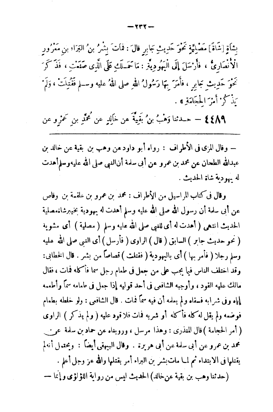 وَقَالَ الْمِزِّيّ فِي الْأَطْرَاف : رَوَاهُ أَبُو دَاوُدَ عَنْ وَهْب بْن بَقِيَّة عَنْ خَالِد بْن عَبْد اللَّه الطَّحَّان عَنْ مُحَمَّد بْن عَمْرو عَنْ أَبِي سَلَمَة أَنَّ النَّبِيّ صَلَّى اللَّه عَلَيْهِ وَسَلَّمَ أَهْدَتْ لَهُ يَهُودِيَّة شَاة الْحَدِيث .