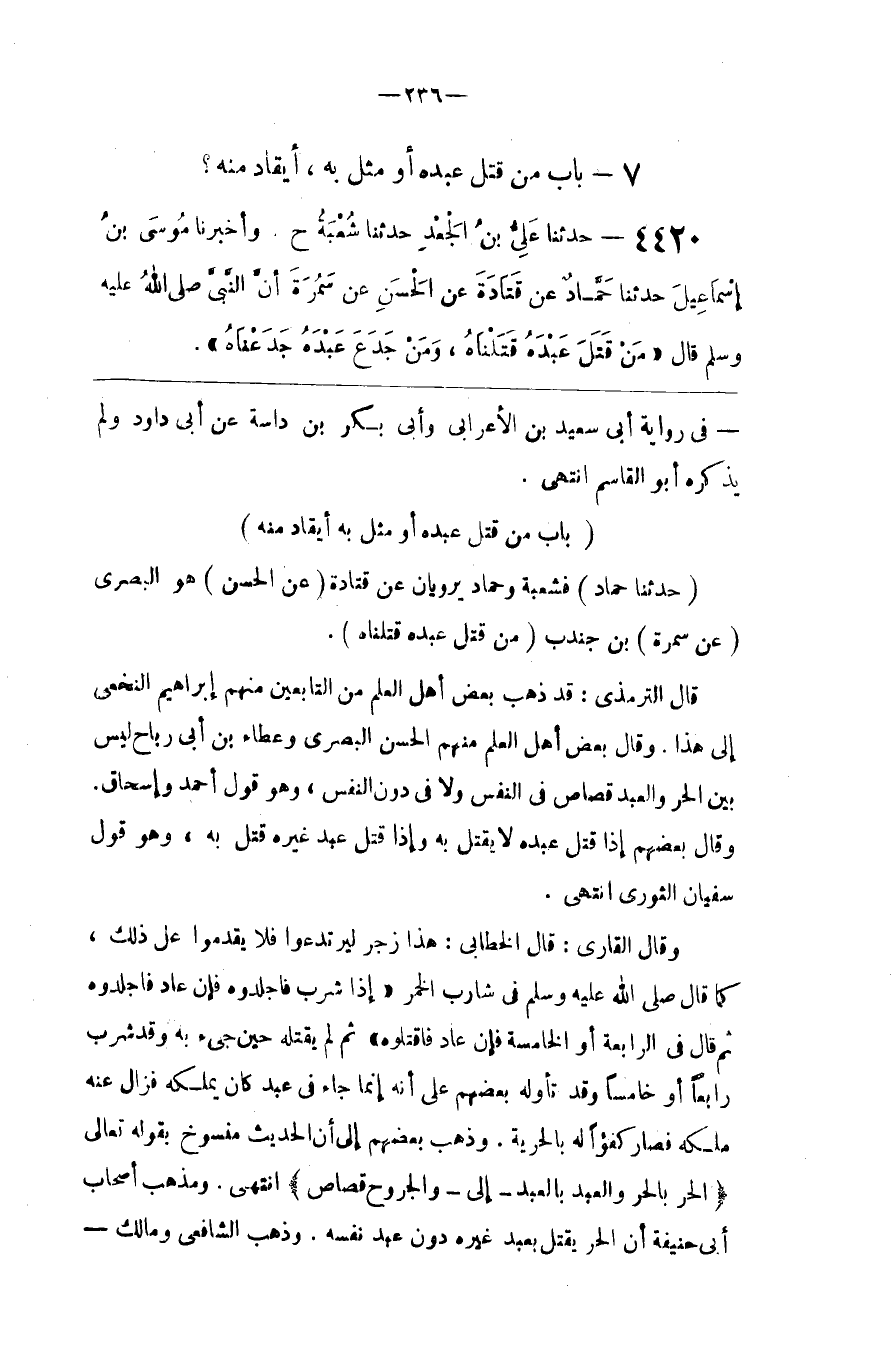 قَالَ التِّرْمِذِيّ : قَدْ ذَهَبَ بَعْض أَهْل الْعِلْم مِنْ التَّابِعِينَ مِنْهُمْ إِبْرَاهِيم النَّخَعِيّ إِلَى هَذَا . وَقَالَ بَعْض أَهْل الْعِلْم مِنْهُمْ الْحَسَن الْبَصْرِيّ وَعَطَاء بْن أَبِي رَبَاح لَيْسَ بَيْن الْحُرّ وَالْعَبْد قِصَاص فِي النَّفْس وَلَا فِي دُون النَّفْس ، وَهُوَ قَوْل أَحْمَد وَإِسْحَاق . وَقَالَ بَعْضهمْ إِذَا قَتَلَ عَبْده لَا يُقْتَل بِهِ وَإِذَا قَتَلَ عَبْد غَيْره قُتِلَ بِهِ ، وَهُوَ قَوْل سُفْيَان الثَّوْرِيّ اِنْتَهَى .