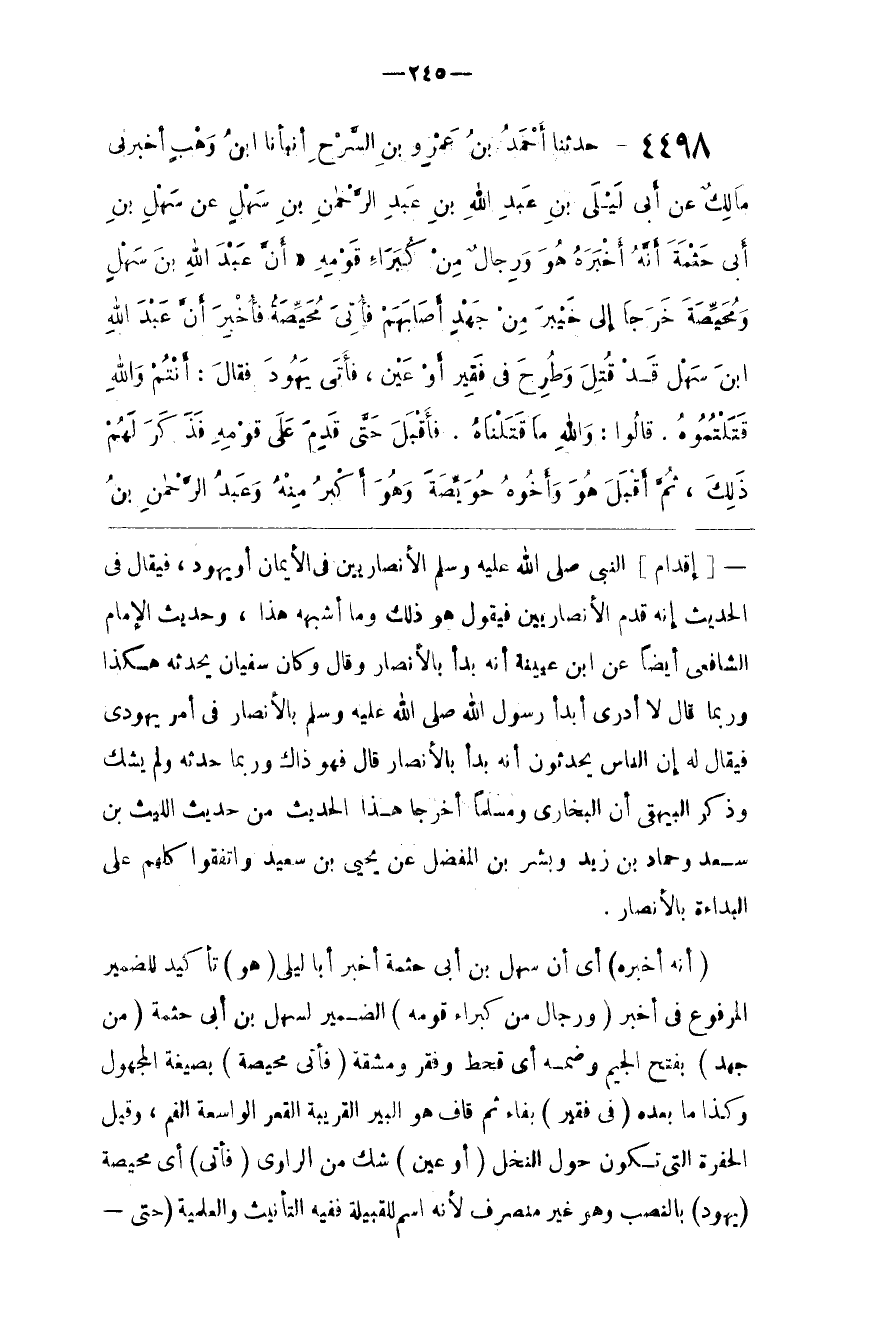 النَّبِيّ صَلَّى اللَّه عَلَيْهِ وَسَلَّمَ الْأَنْصَارِيِّينَ فِي الْأَيْمَان أَوْ يَهُود ، فَيُقَال فِي الْحَدِيث إِنَّهُ قَدَّمَ الْأَنْصَارِيِّينَ فَيَقُول هُوَ ذَلِكَ وَمَا أَشْبَهَهُ هَذَا ، وَحَدِيث الْإِمَام الشَّافِعِيّ أَيْضًا عَنْ اِبْن عُيَيْنَةَ أَنَّهُ بَدَأَ بِالْأَنْصَارِ وَقَالَ وَكَانَ سُفْيَان يُحَدِّثهُ هَكَذَا وَرُبَّمَا قَالَ لَا أَدْرِي أَبْدَأَ رَسُول اللَّه صَلَّى اللَّه عَلَيْهِ وَسَلَّمَ بِالْأَنْصَارِ فِي أَمْر يَهُودِيّ فَيُقَال لَهُ إِنَّ النَّاس يُحَدِّثُونَ أَنَّهُ بَدَأَ بِالْأَنْصَارِ قَالَ فَهُوَ ذَاكَ وَرُبَّمَا حَدَّثَهُ وَلَمْ يَشُكّ وَذَكَرَ الْبَيْهَقِيُّ أَنَّ الْبُخَارِيّ وَمُسْلِمًا أَخْرَجَا هَذَا الْحَدِيث مِنْ حَدِيث اللَّيْث بْن سَعْد وَحَمَّاد بْن زَيْد وَبِشْر بْن الْمُفَضَّل عَنْ يَحْيَى بْن سَعِيد وَاتَّفَقُوا كُلّهمْ عَلَى الْبُدَاءَة بِالْأَنْصَارِ.