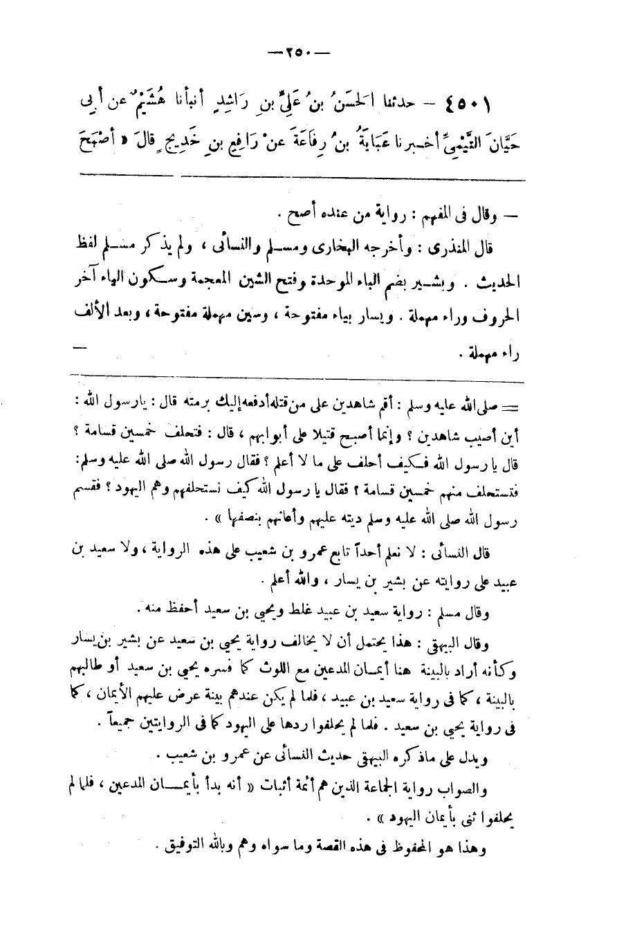 وقال البيهقي هذا يحتمل أن لا يخالف رواية يحيى بن سعيد عن بشير بن يسار وكأنه أراد بالبينة هنا أيمان المدعين مع اللوث كما فسره يحيى بن سعيد أو طالبهم بالبينة كما في رواية سعيد بن عبيد فلما لم يكن عندهم بينة عرض عليهم الأيمان كما في رواية يحيى بن سعيد