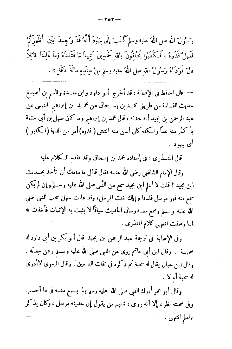 قَالَ الْحَافِظ فِي الْإِصَابَة : قَدْ أَخْرَجَ أَبُو دَاوُدَ وَابْن مَنْدَه وَقَاسِم بْن أَصْبَغ حَدِيث الْقَسَامَة مِنْ طَرِيق مُحَمَّد بْن إِسْحَاق عَنْ مُحَمَّد بْن إِبْرَاهِيم التَّيْمِيّ عَنْ عَبْد الرَّحْمَن بْن بُجَيْدٍ أَنَّهُ حَدَّثَهُ ، قَالَ مُحَمَّد بْن إِبْرَاهِيم وَمَا كَانَ سَهْل بْن أَبِي حَثْمَة بِأَكْثَر مِنْهُ عِلْمًا وَلَكِنَّهُ كَانَ أَسَنّ مِنْهُ اِنْتَهَى