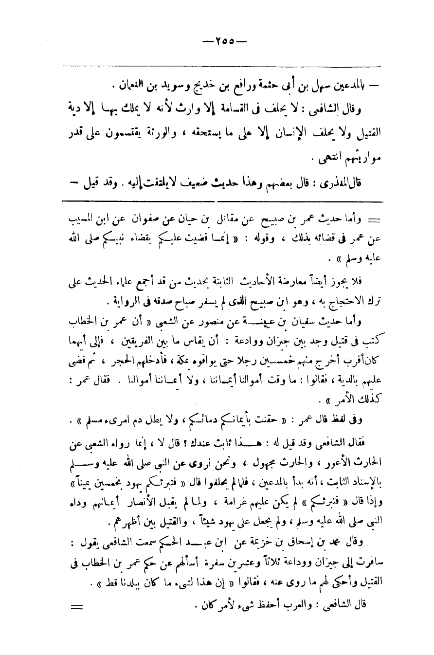 وقال محمد بن إسحاق بن خزيمة عن ابن عبد الحكم سمعت الشافعي يقول سافرت إلى جيزان ووداعة ثلاثا وعشرين سفرة أسألهم عن حكم عمر بن الخطاب في القتيل وأحكي لهم ما روى عنه فقالوا إن هذا لشيء ما كان ببلدنا قط