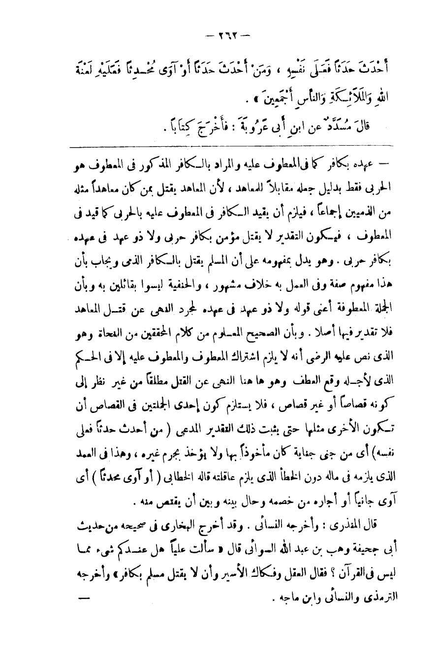 عَهْده بِكَافِرٍ كَمَا فِي الْمَعْطُوف عَلَيْهِ وَالْمُرَاد بِالْكَافِرِ الْمَذْكُور فِي الْمَعْطُوف هُوَ الْحَرْبِيّ فَقَطْ بِدَلِيلِ جَعْله مُقَابِلًا لِلْمُعَاهَدِ ، لِأَنَّ الْمُعَاهَد يُقْتَل بِمَنْ كَانَ مُعَاهَدًا مِثْله مِنْ الذِّمِّيِّينَ إِجْمَاعًا ، فَيَلْزَم أَنْ يُقَيَّد الْكَافِر فِي الْمَعْطُوف عَلَيْهِ بِالْحَرْبِيِّ كَمَا قُيِّدَ فِي الْمَعْطُوف ، فَيَكُون التَّقْدِير لَا يُقْتَل مُؤْمِن بِكَافِرٍ حَرْبِيّ وَلَا ذُو عَهْد فِي عَهْده بِكَافِرٍ حَرْبِيّ . وَهُوَ يَدُلّ بِمَفْهُومِهِ عَلَى أَنَّ الْمُسْلِم يُقْتَل بِالْكَافِرِ الذِّمِّيّ وَيُجَاب بِأَنَّ هَذَا مَفْهُوم صِفَة وَفِي الْعَمَل بِهِ خِلَاف مَشْهُور ، وَالْحَنَفِيَّة لَيْسُوا بِقَائِلِينَ بِهِ وَبِأَنَّ الْجُمْلَة الْمَعْطُوفَة أَعْنِي قَوْله وَلَا ذُو عَهْد فِي عَهْده لِمُجَرَّدِ النَّهْي عَنْ قَتْل الْمُعَاهَد فَلَا تَقْدِير فِيهَا أَصْلًا . وَبِأَنَّ الصَّحِيح الْمَعْلُوم مِنْ كَلَام الْمُحَقِّقِينَ مِنْ النُّحَاة وَهُوَ الَّذِي نَصَّ عَلَى الرِّضَى أَنَّهُ لَا يَلْزَم اِشْتَرَاك الْمَعْطُوف وَالْمَعْطُوف عَلَيْهِ إِلَّا فِي الْحُكْم الَّذِي لِأَجْلِهِ وَقَعَ الْعَطْف وَهُوَ هَا هُنَا النَّهْي عَنْ الْقَتْل مُطْلَقًا مِنْ غَيْر نَظَر إِلَى كَوْنه قِصَاصًا أَوْ غَيْر قِصَاص ، فَلَا يَسْتَلْزِم كَوْن إِحْدَى الْجُمْلَتَيْنِ فِي الْقِصَاص أَنْ تَكُون الْأُخْرَى مِثْلهَا حَتَّى يَثْبُت ذَلِكَ التَّقْدِير الْمُدَّعَى