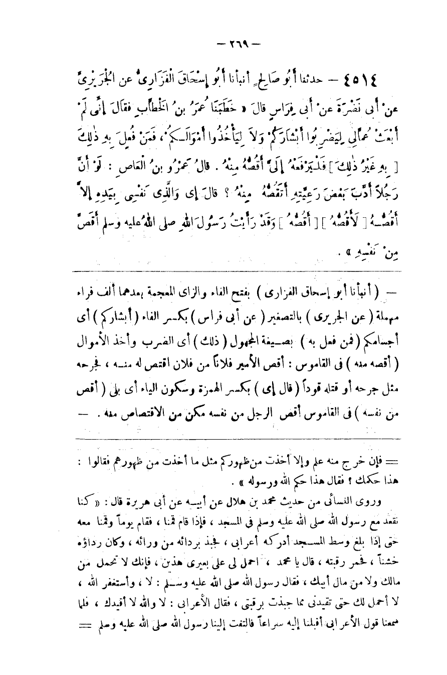 وروى النسائي من حديث محمد بن هلال عن أبيه عن أبي هريرة قال كنا نقعد مع رسول الله في المسجد فإذا قام قمنا فقام يوما وقمنا معه حتى إذا بلغ وسط المسجد أدركه أعرابي فجبذ بردائه من ورائه وكان رداؤه خشنا فحمر رقبته قال يا محمد احمل لي على بعيري هذين فإنك لا تحمل من مالك ولا من مال أبيك فقال رسول الله لا وأستغفر الله لا أحمل لك حتى تقيدني مما جبذت برقبتي فقال الأعرابي لا والله لا أقيدك فلما سمعنا قول الأعرابي أقبلنا إليه سراعا فالتفت إلينا رسول الله صلى الله عليه وسلم