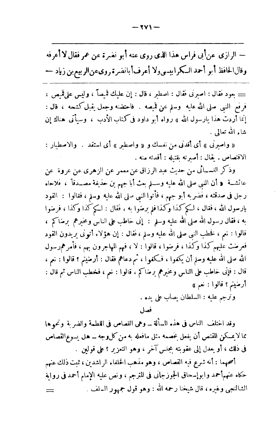 وذكر النسائي من حديث عبد الرزاق عن معمر عن الزهري عن عروة عن عائشة أن النبي بعث أبا جهم بن حذيفة مصدقا فلاحاه رجل في صدقته فضربه أبو جهم فأتوا النبي فقالوا القود يا رسول الله فقال لكم كذا وكذا فلم يرضوا به فقال لكم كذا وكذا فرضوا به فقال رسول الله إني خاطب على الناس ومخبرهم برضاكم قالوا نعم فخطب النبي فقال إن هؤلاء أتوني يريدون القود فعرضت عليهم كذا وكذا فرضوا قالوا لا فهم المهاجرون بهم فأمرهم رسول الله أن يكفوا ثم دعاهم فقال أرضيتم قالوا نعم قال فإني خاطب على الناس ومخبرهم برضاكم قالوا نعم فخطب الناس ثم قال أرضيتم قالوا نعم