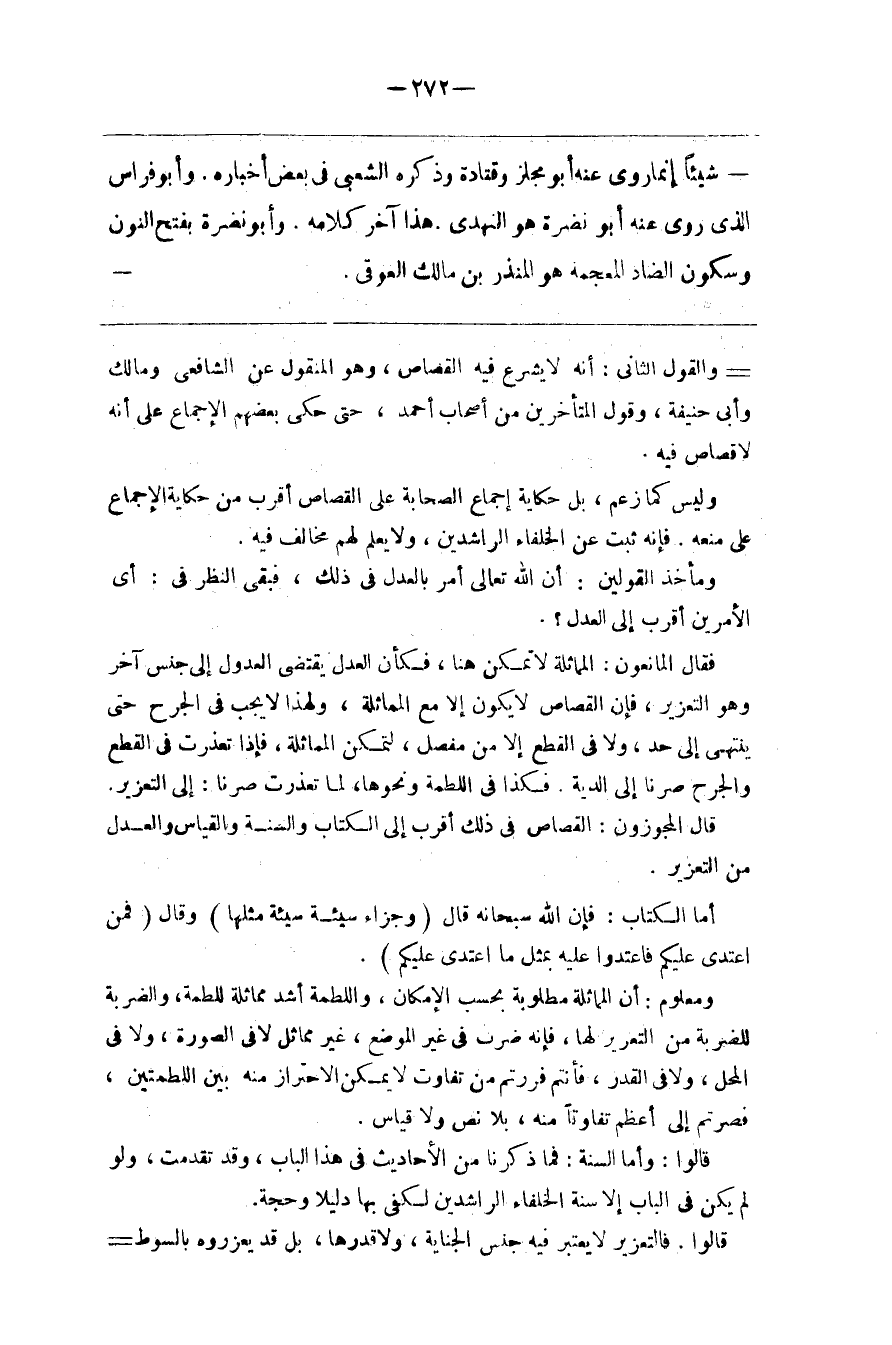 والقول الثاني أنه لا يشرع فيه القصاص وهو المنقول عن الشافعي ومالك وأبي حنيفة وقول المتأخرين من أصحاب أحمد حتى حكى بعضهم الإجماع على أنه لا قصاص فيه