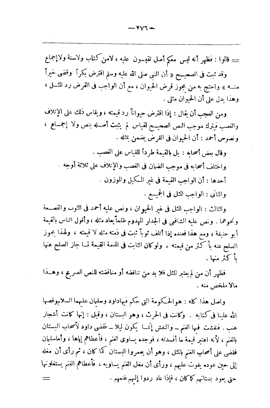 ومن العجب أن يقال إذا اقترض حيوانا رد قيمته ويقاس ذلك على الإتلاف والغصب فيترك موجب النص الصحيح لقياس لم يثبت أصله بنص ولا إجماع ونصوص أحمد أن الحيوان في القرض يضمن بمثله