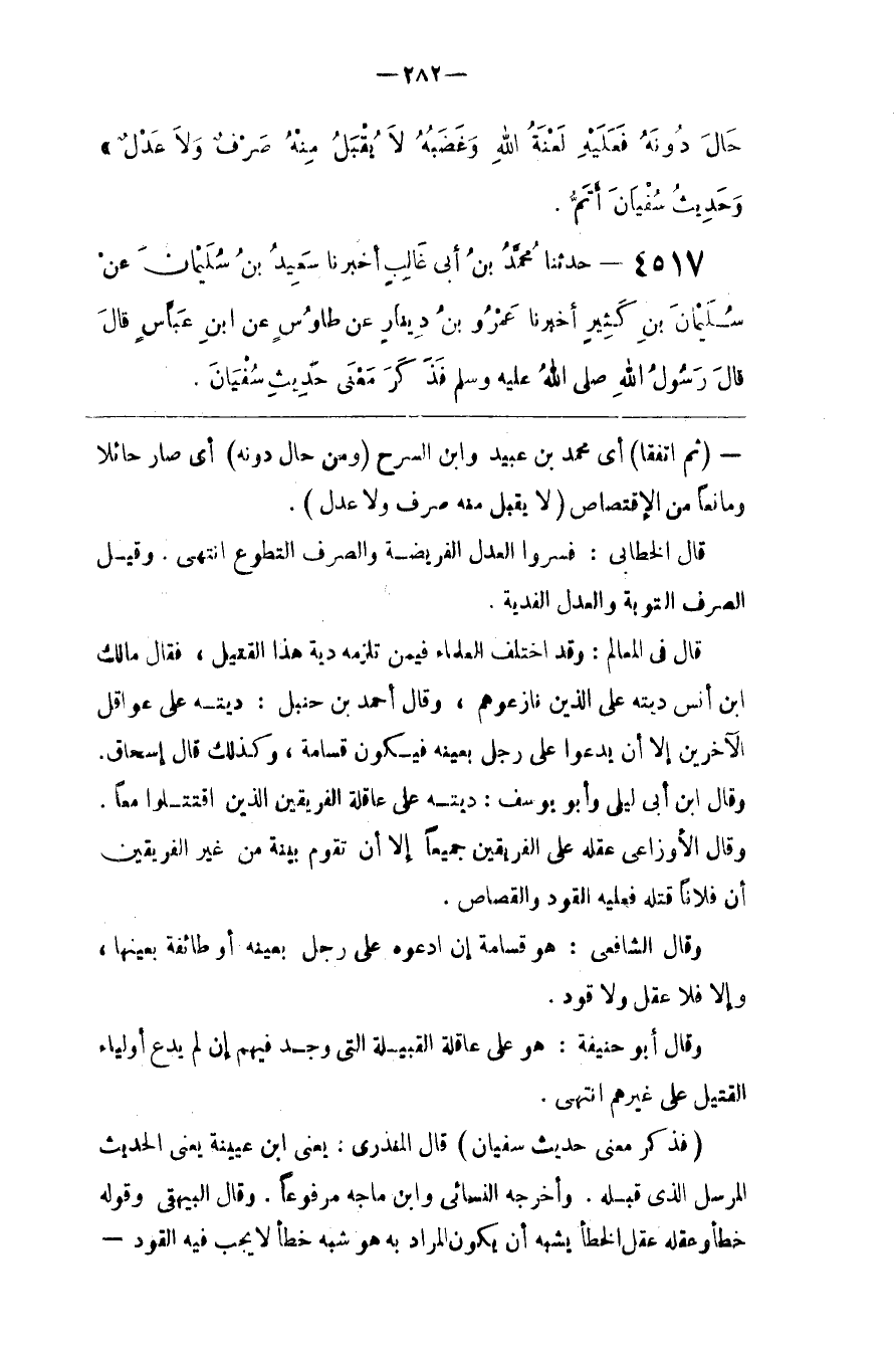 : قَالَ الْمُنْذِرِيُّ : يَعْنِي اِبْن عُيَيْنَةَ يَعْنِي الْحَدِيث الْمُرْسَل الَّذِي قَبْله . وَأَخْرَجَهُ النَّسَائِيُّ وَابْن مَاجَهْ مَرْفُوعًا . وَقَالَ الْبَيْهَقِيُّ وَقَوْله خَطَأ وَعَقْله عَقْل الْخَطَأ يُشْبِه أَنْ يَكُون الْمُرَاد بِهِ هُوَ شِبْه خَطَأ لَا يَجِب فِيهِ الْقَوَد@