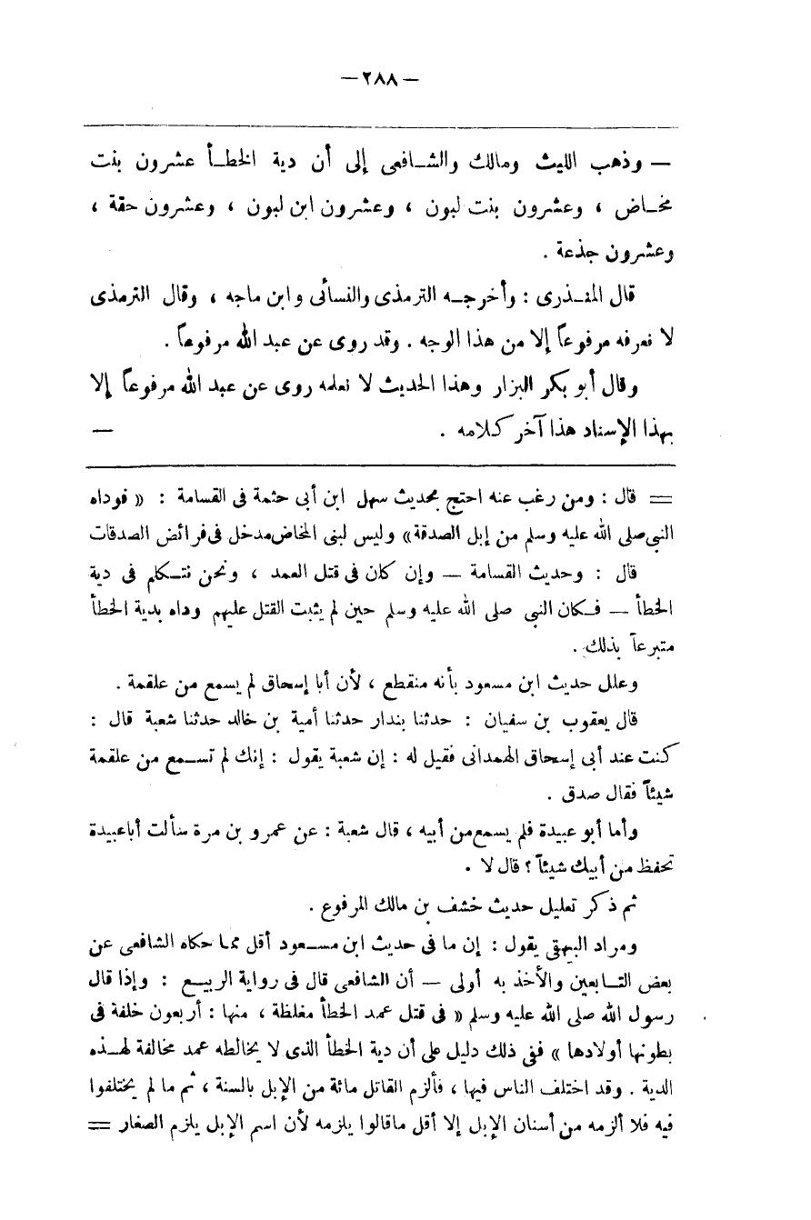 ومراد البيهقي يقول إن ما في حديث ابن مسعود أقل مما حكاه الشافعي عن بعض التابعين والأخذ به أولى أن الشافعي قال في رواية الربيع وإذا قال رسول الله صلى الله عليه و سلم في قتل عمد الخطأ مغلظة منها أربعون خلفة في بطونها أولادها ففي ذلك دليل على أن دية الخطأ الذي لا يخالطه عمد مخالفة لهذه الدية