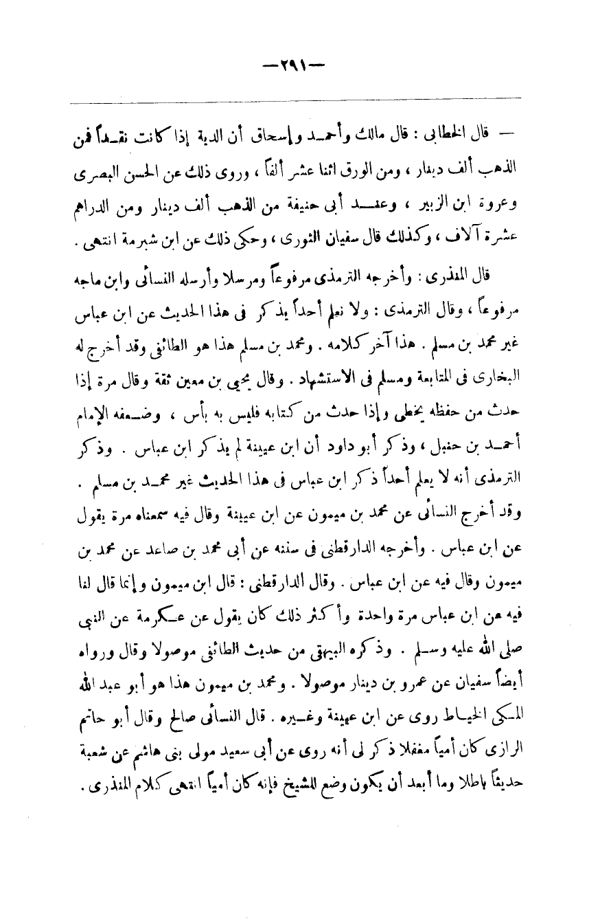 هَذَا آخِر كَلَامه . وَمُحَمَّد بْن مُسْلِم هَذَا هُوَ الطَّائِفِيّ وَقَدْ أَخْرَجَ لَهُ الْبُخَارِيّ فِي الْمُتَابَعَة وَمُسْلِم فِي الِاسْتِشْهَاد . وَقَالَ يَحْيَى بْن مَعِين ثِقَة وَقَالَ مُرَّة إِذَا حَدَّثَ مِنْ حِفْظه يُخْطِئ وَاذَا حَدَّثَ مِنْ كِتَابه فَلَيْسَ بِهِ بَأْس ، وَضَعَّفَهُ الْإِمَام أَحْمَد بْن حَنْبَل ، وَذَكَرَ أَبُو دَاوُدَ أَنَّ اِبْن عُيَيْنَةَ لَمْ يَذْكُر اِبْن عَبَّاس . وَذَكَرَ التِّرْمِذِيّ أَنَّهُ لَا يَعْلَم أَحَدًا ذَكَرَ اِبْن عَبَّاس فِي هَذَا الْحَدِيث غَيْر مُحَمَّد بْن مُسْلِم . وَقَدْ أَخْرَجَ النَّسَائِيُّ عَنْ مُحَمَّد بْن مَيْمُون عَنْ اِبْن عُيَيْنَةَ وَقَالَ فِيهِ سَمِعْنَاهُ مَرَّة يَقُول عَنْ اِبْن عَبَّاس . وَأَخْرَجَهُ الدَّارَقُطْنِيُّ فِي سُنَنه عَنْ أَبِي مُحَمَّد بْن صَاعِد عَنْ مُحَمَّد بْن مَيْمُون وَقَالَ فِيهِ عَنْ اِبْن عَبَّاس. وَقَالَ الدَّارَقُطْنِيُّ : قَالَ اِبْن مَيْمُون وَإِنَّمَا قَالَ لَنَا فِيهِ عَنْ اِبْن عَبَّاس مَرَّة وَاحِدَة وَأَكْثَر ذَلِكَ كَانَ يَقُول عَنْ عِكْرِمَة عَنْ النَّبِيّ صَلَّى اللَّه عَلَيْهِ وَسَلَّمَ . وَذَكَرَهُ الْبَيْهَقِيُّ مِنْ حَدِيث الطَّائِفِيّ مَوْصُولًا وَقَالَ وَرَوَاهُ أَيْضًا سُفْيَان عَنْ عَمْرو بْن دِينَار مَوْصُولًا. وَمُحَمَّد بْن مَيْمُون هَذَا هُوَ أَبُو عَبْد اللَّه الْمَكِّيّ الْخَيَّاط رَوَى عَنْ اِبْن عُيَيْنَةَ وَغَيْره . قَالَ النَّسَائِيُّ صَالِح وَقَالَ أَبُو حَاتِم الرَّازِيُّ كَانَ أُمِّيًّا مُغَفَّلًا ذَكَرَ لِي أَنَّهُ رَوَى عَنْ أَبِي سَعِيد مَوْلَى بَنِي هَاشِم عَنْ شُعْبَة حَدِيثًا بَاطِلًا وَمَا أَبْعَد أَنْ يَكُون وُضِعَ لِلشَّيْخِ فَإِنَّهُ كَانَ أُمِّيًّا اِنْتَهَى كَلَام الْمُنْذِرِيِّ .@