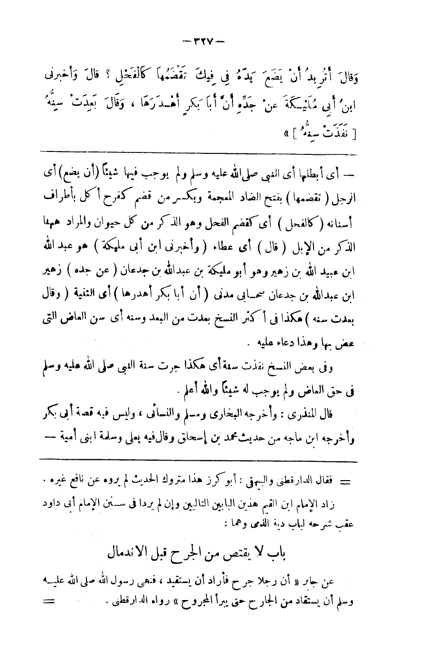 زاد الإمام ابن القيم هذين البابين التاليين وإن لم يردا في سنن الإمام أبي داود عقب شرحه لباب دية الذمي وهما باب لا يقتص من الجرح قبل الاندمال عن جابر أن رجلا جرح فأراد أن يستقيد فنهى رسول الله صلى الله عليه و سلم أن يستقاد من الجارح حتى يبرأ المجروح رواه الدارقطني