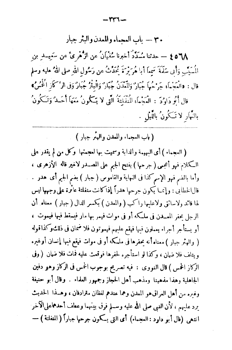 : قَالَ النَّوَوِيّ : فِيهِ تَصْرِيح بِوُجُوبِ الْخُمْس فِي الرِّكَاز وَهُوَ دَفِين الْجَاهِلِيَّة وَهَذَا مَذْهَبنَا وَمَذْهَب أَهْل الْحِجَاز وَجُمْهُور الْعُلَمَاء وَقَالَ أَبُو حَنِيفَة وَغَيْره مِنْ أَهْل الْعِرَاق هُوَ الْمَعْدِن وَهُمَا عِنْدهمْ لَفْظَانِ مُتَرَادِفَانِ ، هَذَا الْحَدِيث يَرُدّ عَلَيْهِمْ ، لِأَنَّ النَّبِيّ صَلَّى اللَّه عَلَيْهِ وَسَلَّمَ فَرَّقَ بَيْنهمَا وَعَطَفَ أَحَدهمَا عَلَى الْآخَر اِنْتَهَى