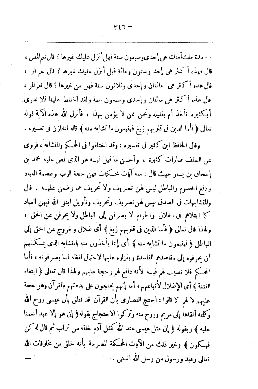 مُدَّة مُلْك أُمَّتك هِيَ إِحْدَى وَسَبْعُونَ سَنَة فَهَلْ أُنْزِلَ عَلَيْك غَيْرهَا ؟ قَالَ نَعَمْ المص ، قَالَ فَهَذِهِ أَكْثَر هِيَ إِحْدَى وَسِتُّونَ وَمِائَة فَهَلْ أُنْزِلَ عَلَيْك غَيْرهَا ؟ قَالَ نَعَمْ الر ، قَالَ هَذِهِ أَكْثَر هِيَ مِائَتَانِ وَإِحْدَى وَثَلَاثُونَ سَنَة فَهَلْ مِنْ غَيْرهَا ؟ قَالَ نَعَمْ المر ، قَالَ هَذِهِ أَكْثَر هِيَ مِائَتَانِ وَإِحْدَى وَسَبْعُونَ سَنَة وَلَقَدْ اِخْتَلَطَ عَلَيْنَا فَلَا نَدْرِي أَبِكَثِيرِهِ نَأْخُذ أَمْ بِقَلِيلِهِ وَنَحْنُ مِمَّنْ لَا يُؤْمِن بِهَذَا ، فَأَنْزَلَ اللَّه هَذِهِ الْآيَة قَوْله تَعَالَى { فَأَمَّا الَّذِينَ فِي قُلُوبهمْ زَيْغ فَيَتَّبِعُونَ مَا تَشَابَهَ مِنْهُ } : قَالَهُ الْخَازِن فِي تَفْسِيره . وَقَالَ الْحَافِظ اِبْن كَثِير فِي تَفْسِيره : وَقَدْ اِخْتَلَفُوا فِي الْمُحْكَم وَالْمُتَشَابِه ، فَرُوِيَ عَنْ السَّلَف عِبَارَات كَثِيرَة ، وَأَحْسَن مَا قِيلَ فِيهِ هُوَ الَّذِي نَصَّ عَلَيْهِ مُحَمَّد بْن إِسْحَاق بْن يَسَار حَيْثُ قَالَ : مِنْهُ آيَات مُحْكَمَات فَهُنَّ حُجَّة الرَّبّ وَعِصْمَة الْعِبَاد وَدَفْع الْخُصُوم وَالْبَاطِل لَيْسَ لَهُنَّ تَصْرِيف وَلَا تَحْرِيف عَمَّا وُضِعْنَ عَلَيْهِ . قَالَ وَالْمُتَشَابِهَات فِي الصِّدْق لَيْسَ لَهُنَّ تَصْرِيف وَتَحْرِيف وَتَأْوِيل اِبْتَلَى اللَّه فِيهِنَّ الْعِبَاد كَمَا اِبْتَلَاهُمْ فِي الْحَلَال وَالْحَرَام لَا يُصْرَفْنَ إِلَى الْبَاطِل وَلَا يُحَرَّفْنَ عَنْ الْحَقّ ، وَلِهَذَا قَالَ تَعَالَى { فَأَمَّا الَّذِينَ فِي قُلُوبهمْ زَيْغ } : أَيْ ضَلَال وَخُرُوج عَنْ الْحَقّ إِلَى الْبَاطِل { فَيَتَّبِعُونَ مَا تَشَابَهَ مِنْهُ } : أَيْ إِنَّمَا يَأْخُذُونَ مِنْهُ بِالْمُتَشَابِهِ الَّذِي يُمَكِّنهُمْ أَنْ يُحَرِّفُوهُ إِلَى مَقَاصِدهمْ الْفَاسِدَة وَيُنْزِلُوهُ عَلَيْهَا لِاحْتِمَالِ لَفْظه لِمَا يَصْرِفُونَهُ ، فَأَمَّا الْمُحْكَم فَلَا نَصِيب لَهُمْ فِيهِ لِأَنَّهُ دَافِع لَهُمْ وَحُجَّة عَلَيْهِمْ وَلِهَذَا قَالَ تَعَالَى { اِبْتِغَاء الْفِتْنَة } : أَيْ الْإِضْلَال لِأَتْبَاعِهِمْ ، أَمَّا إِنَّهُمْ يَحْتَجُّونَ عَلَى بِدْعَتهمْ بِالْقُرْآنِ وَهُوَ حُجَّة عَلَيْهِمْ لَا لَهُمْ كَمَا قَالُوا : اِحْتَجَّ النَّصَارَى بِأَنَّ الْقُرْآن قَدْ نَطَقَ بِأَنَّ عِيسَى رُوح اللَّه وَكَلِمَته أَلْقَاهَا إِلَى مَرْيَم وَرُوح مِنْهُ وَتَرَكُوا الِاحْتِجَاج بِقَوْلِهِ { إِنْ هُوَ إِلَّا عَبْد أَنْعَمْنَا عَلَيْهِ } : وَبِقَوْلِهِ { إِنَّ مَثَل عِيسَى عِنْد اللَّه كَمَثَلِ آدَم خَلَقَهُ مِنْ تُرَاب ثُمَّ قَالَ لَهُ كُنْ فَيَكُون } : وَغَيْر ذَلِكَ مِنْ الْآيَات الْمُحْكَمَة الْمُصَرِّحَة بِأَنَّهُ خَلْق مِنْ مَخْلُوقَات اللَّه تَعَالَى وَعَبْد وَرَسُول مِنْ رُسُل اللَّه اِنْتَهَى @