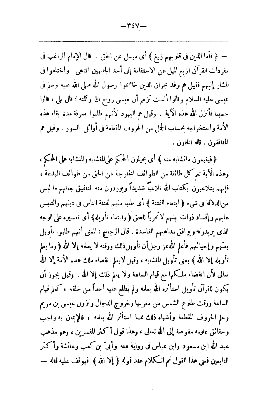 { فَأَمَّا الَّذِينَ فِي قُلُوبهمْ زَيْغ } : أَيْ مَيْل عَنْ الْحَقّ . قَالَ الْإِمَام الرَّاغِب فِي مُفْرَدَات الْقُرْآن الزَّيْغ الْمَيْل عَنْ الِاسْتِقَامَة إِلَى أَحَد الْجَانِبَيْنِ اِنْتَهَى . وَاخْتَلَفُوا فِي الْمُشَار إِلَيْهِمْ فَقِيلَ هُمْ وَفْد نَجْرَان الَّذِينَ خَاصَمُوا رَسُول اللَّه صَلَّى اللَّه عَلَيْهِ وَسَلَّمَ فِي عِيسَى عَلَيْهِ السَّلَام وَقَالُوا أَلَسْت تَزْعُم أَنَّ عِيسَى رُوح اللَّه وَكَلِمَته ؟ قَالَ بَلَى ، قَالُوا حَسْبنَا فَأَنْزَلَ اللَّه هَذِهِ الْآيَة . وَقِيلَ هُمْ الْيَهُود لِأَنَّهُمْ طَلَبُوا مَعْرِفَة مُدَّة بَقَاء هَذِهِ الْأُمَّة قَالَهُ الْخَازِن . { فَيَتَّبِعُونَ مَا تَشَابَهَ مِنْهُ } : أَيْ يُحِيلُونَ الْمُحْكَم عَلَى الْمُتَشَابِه وَالْمُتَشَابِه عَلَى الْمُحْكَم ، وَهَذِهِ الْآيَة تَعُمّ كُلّ طَائِفَة مِنْ الطَّوَائِف الْخَارِجَة عَنْ الْحَقّ مِنْ طَوَائِف الْبِدْعَة ، فَإِنَّهُمْ يَتَلَاعَبُونَ بِكِتَابِ اللَّه تَلَاعُبًا شَدِيدًا وَيُورِدُونَ مِنْهُ لِتَنْفِيقِ جَهْلهمْ مَا لَيْسَ مِنْ الدَّلَالَة فِي شَيْء { اِبْتِغَاء الْفِتْنَة } : أَيْ طَلَبًا مِنْهُمْ لِفِتْنَةِ النَّاس فِي دِينهمْ وَالتَّلَبُّس عَلَيْهِمْ وَإِفْسَاد ذَوَات بَيْنهمْ لَا تَحَرِّيًا لِلْحَقِّ { وَابْتِغَاء تَأْوِيله } : أَيْ تَفْسِيره عَلَى الْوَجْه الَّذِي يُرِيدُونَهُ وَيُوَافِق مَذَاهِبهمْ الْفَاسِدَة . قَالَ الزَّجَّاج : الْمَعْنَى أَنَّهُمْ طَلَبُوا تَأْوِيل بَعْثهمْ وَإِحْيَائِهِمْ فَأَعْلَمَ اللَّه عَزَّ وَجَلَّ أَنَّ تَأْوِيل ذَلِكَ وَوَقْته لَا يَعْلَمهُ إِلَّا اللَّه { وَمَا يَعْلَم تَأْوِيله إِلَّا اللَّه } : يَعْنِي تَأْوِيل الْمُتَشَابِه ، وَقِيلَ لَا يَعْلَم اِنْقِضَاء مُلْك هَذِهِ الْأُمَّة إِلَّا اللَّه تَعَالَى لِأَنَّ اِنْقِضَاء مُلْكهَا مَعَ قِيَام السَّاعَة وَلَا يَعْلَم ذَلِكَ إِلَّا اللَّه . وَقِيلَ يَجُوز أَنْ يَكُون لِلْقُرْآنِ تَأْوِيل اِسْتَأْثَرَهُ اللَّه بِعِلْمِهِ وَلَمْ يُطْلِع عَلَيْهِ أَحَدًا مِنْ خَلْقه ، كَعِلْمِ قِيَام السَّاعَة وَوَقْت طُلُوع الشَّمْس مِنْ مَغْرِبهَا وَخُرُوج الدَّجَّال وَنُزُول عِيسَى بْن مَرْيَم وَعِلْم الْحُرُوف الْمُقَطَّعَة وَأَشْبَاه ذَلِكَ مِمَّا اِسْتَأْثَرَ اللَّه بِعِلْمِهِ ، فَالْإِيمَان بِهِ وَاجِب وَحَقَائِق عُلُومه مُفَوَّضَة إِلَى اللَّه تَعَالَى ، وَهَذَا قَوْل أَكْثَر الْمُفَسِّرِينَ ، وَهُوَ مَذْهَب عَبْد اللَّه بْن مَسْعُود وَابْن عَبَّاس فِي رِوَايَة عَنْهُ وَأُبَيّ بْن كَعْب وَعَائِشَة وَأَكْثَر التَّابِعِينَ فَعَلَى هَذَا الْقَوْل تَمَّ الْكَلَام عِنْد قَوْله { إِلَّا اللَّه } : فَيُوقَف عَلَيْهِ قَالَهُ@