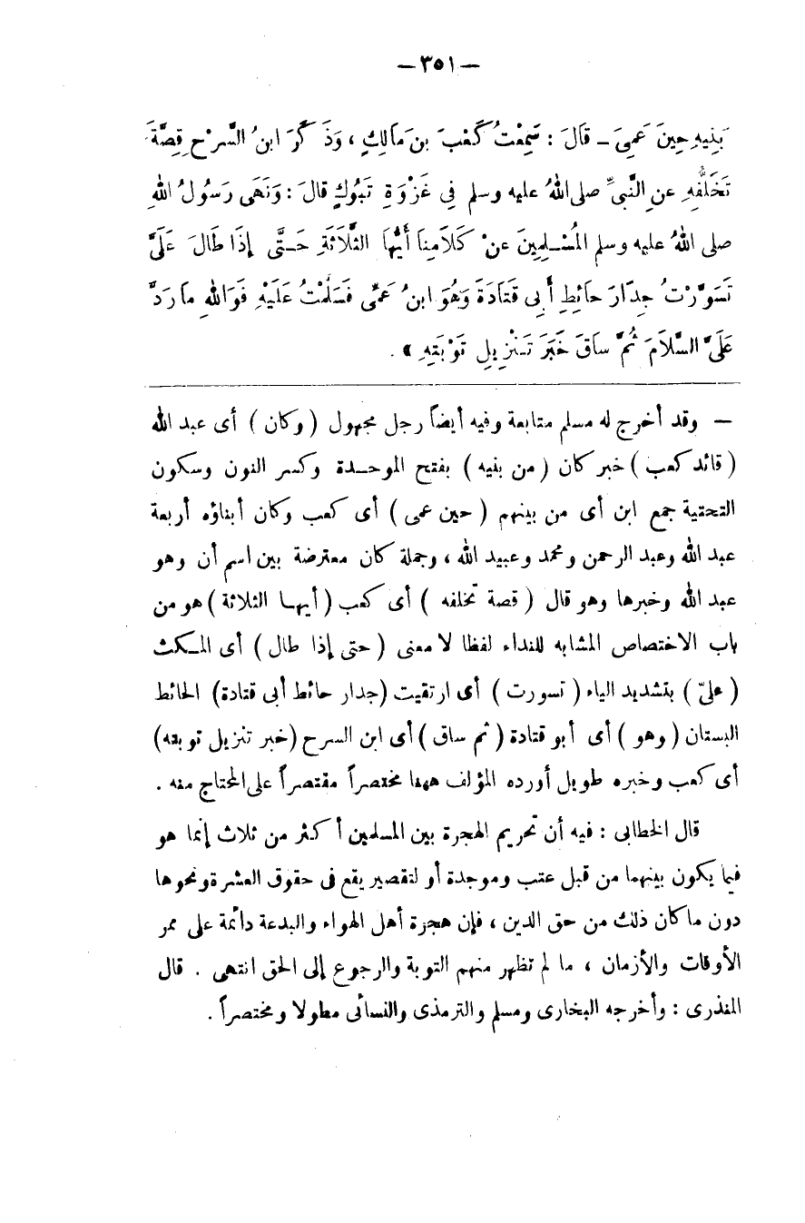 قَالَ الْخَطَّابِيُّ : فِيهِ أَنَّ تَحْرِيم الْهِجْرَة بَيْن الْمُسْلِمِينَ أَكْثَر مِنْ ثَلَاث إِنَّمَا هُوَ فِيمَا يَكُون بَيْنهمَا مِنْ قِبَل عُتْب وَمُوجِدَة أَوْ لِتَقْصِيرٍ يَقَع فِي حُقُوق الْعِشْرَة وَنَحْوهَا دُون مَا كَانَ ذَلِكَ مِنْ حَقّ الدِّين ، فَإِنَّ هِجْرَة أَهْل الْهَوَاء وَالْبِدْعَة دَائِمَة عَلَى مَمَرّ الْأَوْقَات وَالْأَزْمَان ، مَا لَمْ تَظْهَر مِنْهُمْ التَّوْبَة وَالرُّجُوع إِلَى الْحَقّ اِنْتَهَى . قَالَ الْمُنْذِرِيُّ : وَأَخْرَجَهُ الْبُخَارِيّ وَمُسْلِم وَالتِّرْمِذِيّ مُطَوَّلًا وَمُخْتَصَرًا .@