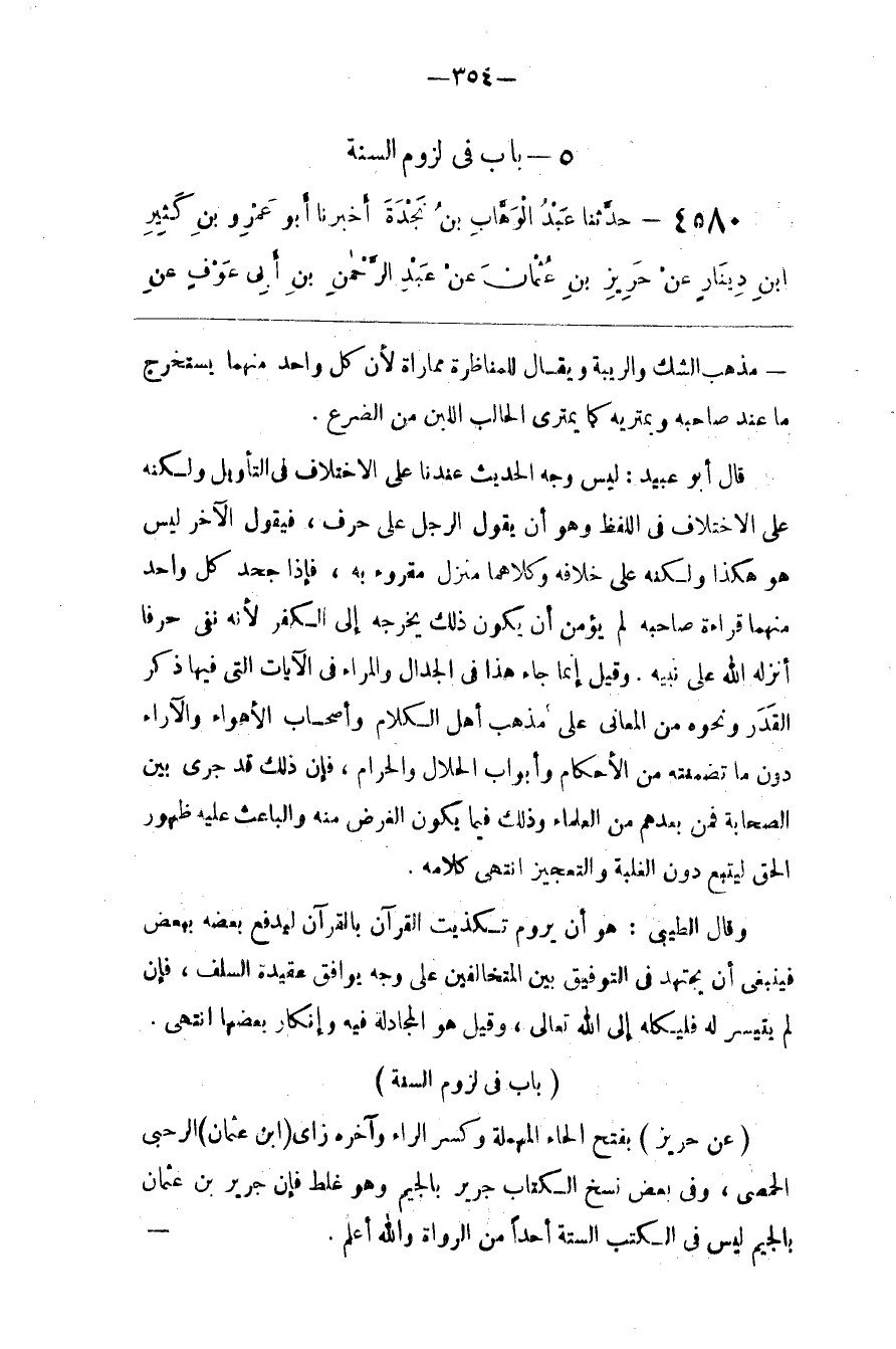 قَالَ أَبُو عُبَيْد : لَيْسَ وَجْه الْحَدِيث عِنْدنَا عَلَى الِاخْتِلَاف فِي التَّأْوِيل وَلَكِنَّهُ عَلَى الِاخْتِلَاف فِي اللَّفْظ وَهُوَ أَنْ يَقُول الرَّجُل عَلَى حَرْف ، فَيَقُول الْآخَر لَيْسَ هُوَ هَكَذَا وَلَكِنَّهُ عَلَى خِلَافه وَكِلَاهُمَا مُنَزَّل مَقْرُوء بِهِ ، فَإِذَا جَحَدَ كُلّ وَاحِد مِنْهُمَا قِرَاءَة صَاحِبه لَمْ يُؤْمَن أَنْ يَكُون ذَلِكَ يُخْرِجهُ إِلَى الْكُفْر لِأَنَّهُ نَفَى حَرْفًا أَنْزَلَهُ اللَّه عَلَى نَبِيّه . وَقِيلَ إِنَّمَا جَاءَ هَذَا فِي الْجِدَال وَالْمِرَاء فِي الْآيَات الَّتِي فِيهَا ذِكْر الْقَدَر وَنَحْوه مِنْ الْمَعَانِي عَلَى مَذْهَب أَهْل الْكَلَام وَأَصْحَاب الْأَهْوَاء وَالْآرَاء دُون مَا تَضَمَّنَتْهُ مِنْ الْأَحْكَام وَأَبْوَاب الْحَلَال وَالْحَرَام ، فَإِنَّ ذَلِكَ قَدْ جَرَى بَيْن الصَّحَابَة فَمَنْ بَعْدهمْ مِنْ الْعُلَمَاء وَذَلِكَ فِيمَا يَكُون الْغَرَض مِنْهُ وَالْبَاعِث عَلَيْهِ ظُهُور الْحَقّ لِيُتْبَع دُون الْغَلَبَة وَالتَّعْجِيز اِنْتَهَى كَلَامه .