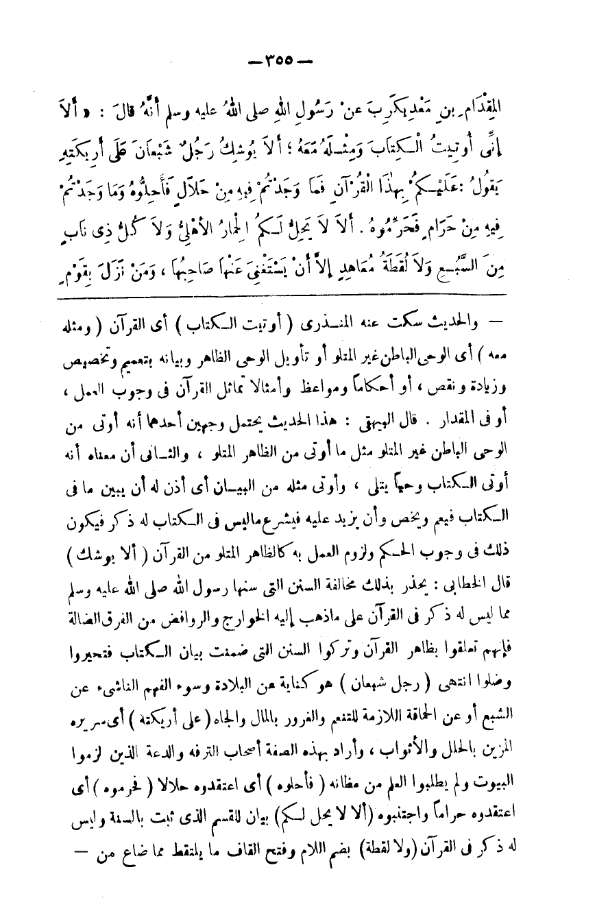 : أَيْ الْوَحْي الْبَاطِن غَيْر الْمَتْلُوّ أَوْ تَأْوِيل الْوَحْي الظَّاهِر وَبَيَانه بِتَعْمِيمٍ وَتَخْصِيص وَزِيَادَة وَنَقْص ، أَوْ أَحْكَامًا وَمَوَاعِظ وَأَمْثَالًا تُمَاثِل الْقُرْآن فِي وُجُوب الْعَمَل ، أَوْ فِي الْمِقْدَار قَالَ الْبَيْهَقِيُّ : هَذَا الْحَدِيث يَحْتَمِل وَجْهَيْنِ أَحَدهمَا أَنَّهُ أُوتِيَ مِنْ الْوَحْي الْبَاطِن غَيْر الْمَتْلُوّ مِثْل مَا أُوتِيَ مِنْ الظَّاهِر الْمَتْلُوّ ، وَالثَّانِي أَنَّ مَعْنَاهُ أَنَّهُ أُوتِيَ الْكِتَاب وَحْيًا يُتْلَى ، وَأُوتِيَ مِثْله مِنْ الْبَيَان أَيْ أُذِنَ لَهُ أَنْ يُبَيِّن مَا فِي الْكِتَاب فَيَعُمّ وَيَخُصّ وَأَنْ يَزِيد عَلَيْهِ فَيُشَرِّع مَا لَيْسَ فِي الْكِتَاب لَهُ ذِكْر فَيَكُون ذَلِكَ فِي وُجُوب الْحُكْم وَلُزُوم الْعَمَل بِهِ كَالظَّاهِرِ الْمَتْلُوّ مِنْ الْقُرْآن
