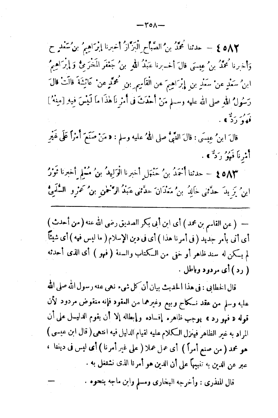 قَالَ الْخَطَّابِيُّ : فِي هَذَا الْحَدِيث بَيَان أَنَّ كُلّ شَيْء نَهَى عَنْهُ رَسُول اللَّه صَلَّى اللَّه عَلَيْهِ وَسَلَّمَ مِنْ عَقْد نِكَاح وَبَيْع وَغَيْرهمَا مِنْ الْعُقُود فَإِنَّهُ مَنْقُوض مَرْدُود لِأَنَّ قَوْله " فَهُوَ رَدّ " يُوجِب ظَاهِره إِفْسَاده وَإِبْطَاله إِلَّا أَنْ يَقُوم الدَّلِيل عَلَى أَنَّ الْمُرَاد بِهِ غَيْر الظَّاهِر فَيَنْزِل الْكَلَام عَلَيْهِ لِقِيَامِ الدَّلِيل فِيهِ اِنْتَهَى