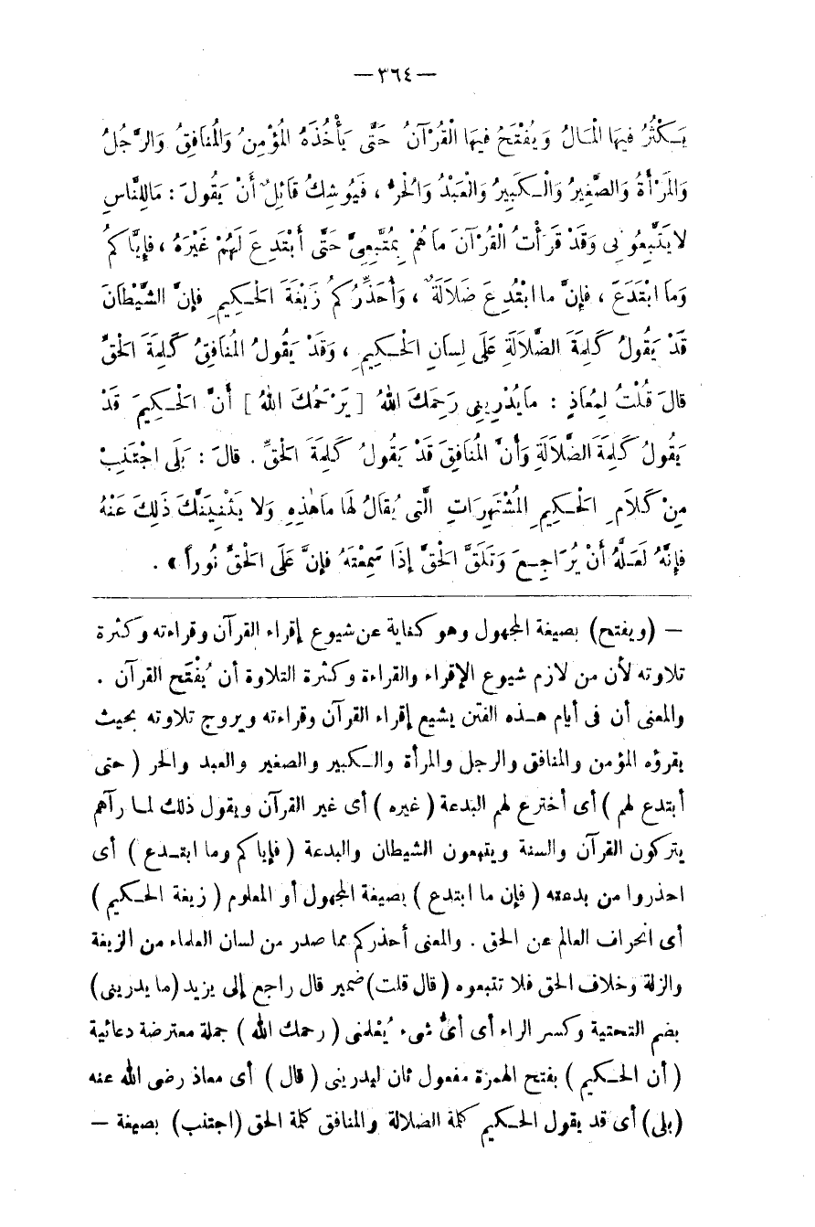 : بِصِيغَةِ الْمَجْهُول وَهُوَ كِنَايَة عَنْ شُيُوع إِقْرَاء الْقُرْآن وَقِرَاءَته وَكَثْرَة تِلَاوَته لِأَنَّ مِنْ لَازِم شُيُوع الْإِقْرَاء وَالْقِرَاءَة وَكَثْرَة التِّلَاوَة أَنْ يُفْتَح الْقُرْآن . وَالْمَعْنَى أَنَّ فِي أَيَّام هَذِهِ الْفِتَن يَشِيع إِقْرَاء الْقُرْآن وَقِرَاءَته وَيَرُوج تِلَاوَته بِحَيْثُ يَقْرَؤُهُ الْمُؤْمِن وَالْمُنَافِق وَالرَّجُل وَالْمَرْأَة وَالْكَبِير وَالصَّغِير وَالْعَبْد وَالْحُرّ