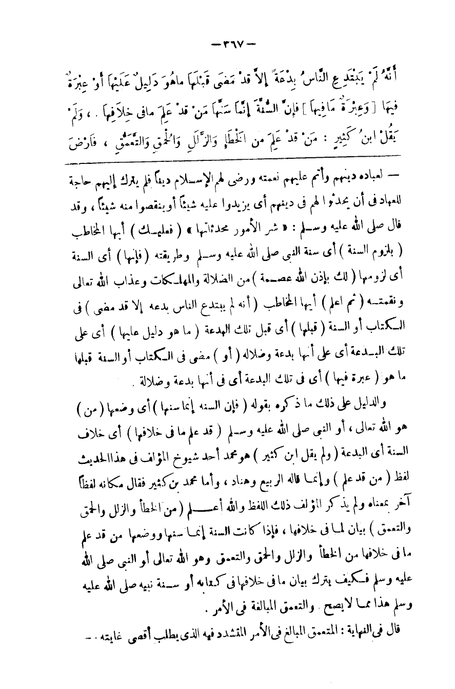 : بَيَان لِمَا فِي خِلَافهَا ، فَإِذَا كَانَتْ السُّنَّة إِنَّمَا سَنَّهَا وَوَضَعَهَا مَنْ قَدْ عَلِمَ مَا فِي خِلَافهَا مِنْ الْخَطَأ وَالزَّلَل وَالْحُمْق وَالتَّعَمُّق وَهُوَ اللَّه تَعَالَى أَوْ النَّبِيّ صَلَّى اللَّه عَلَيْهِ وَسَلَّمَ فَكَيْف يُتْرَك بَيَان مَا فِي خِلَافهَا فِي كِتَابه أَوْ سُنَّة نَبِيّه صَلَّى اللَّه عَلَيْهِ وَسَلَّمَ هَذَا مِمَّا لَا يَصِحّ وَالتَّعَمُّق الْمُبَالَغَة فِي الْأَمْر.