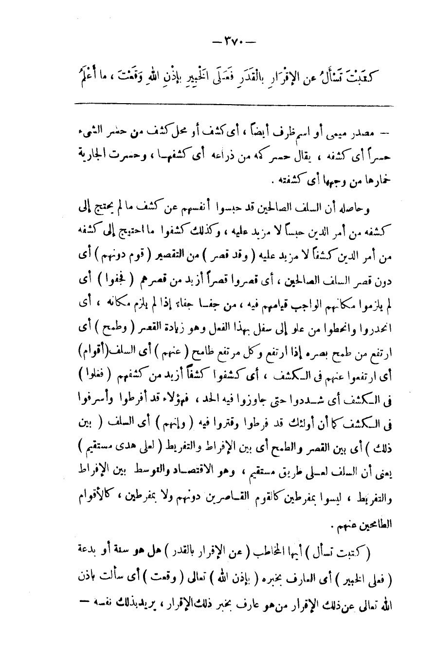 وَحَاصِله أَنَّ السَّلَف الصَّالِحِينَ قَدْ حَبَسُوا أَنْفُسهمْ عَنْ كَشْف مَا لَمْ يُحْتَجْ إِلَى كَشْفه مِنْ أَمْر الدِّين حَبْسًا لَا مَزِيد عَلَيْهِ ، وَكَذَلِكَ كَشَفُوا مَا اُحْتِيجَ إِلَى كَشْفه مِنْ أَمْر الدِّين كَشْفًا لَا مَزِيد عَلَيْهِ