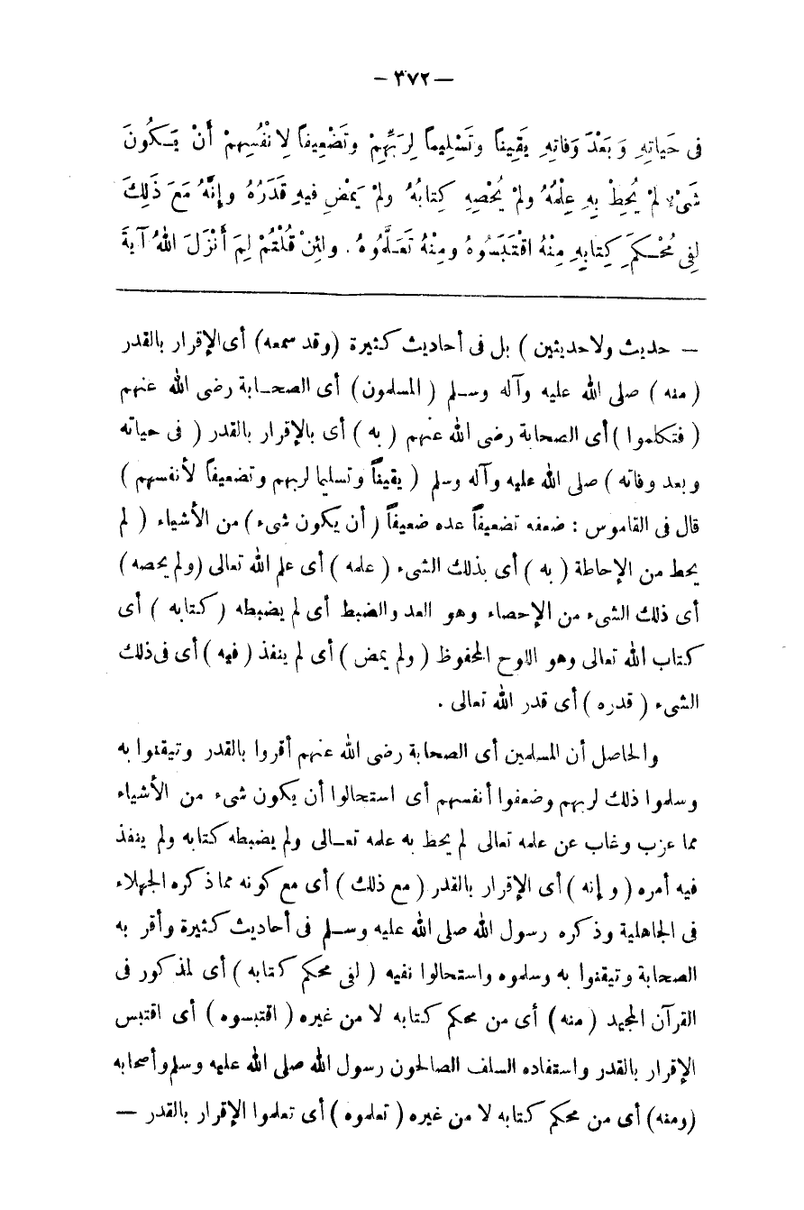 وَالْحَاصِل أَنَّ الْمُسْلِمِينَ أَيْ الصَّحَابَة رَضِيَ اللَّه عَنْهُمْ أَقَرُّوا بِالْقَدَرِ وَتَيَقَّنُوا بِهِ وَسَلَّمُوا ذَلِكَ لِرَبِّهِمْ وَضَعَّفُوا أَنْفُسهمْ أَيْ اِسْتَحَالُوا أَنْ يَكُون شَيْء مِنْ الْأَشْيَاء مِمَّا عَزَبَ وَغَابَ عَنْ عِلْمه تَعَالَى لَمْ يُحِطْ بِهِ عِلْمه تَعَالَى وَلَمْ يَضْبِطهُ كِتَابه وَلَمْ يَنْفُذ فِيهِ أَمْره