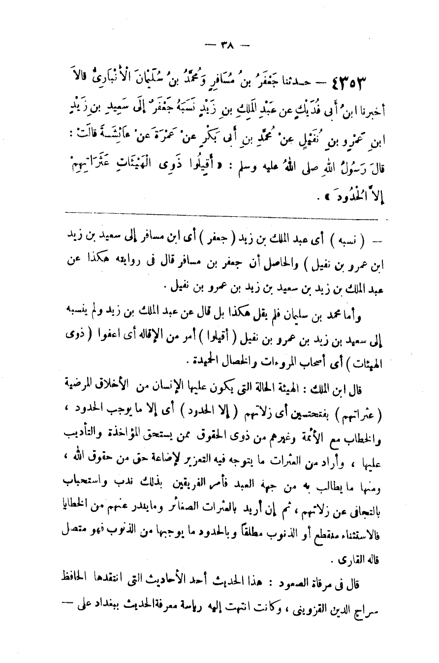 : أَيْ إِلَّا مَا يُوجِب الْحُدُود ، وَالْخِطَاب مَعَ الْأَئِمَّة وَغَيْرهمْ مِنْ ذَوِي الْحُقُوق مِمَّنْ يَسْتَحِقّ الْمُؤَاخَذَة وَالتَّأْدِيب عَلَيْهَا ، وَأَرَادَ مِنْ الْعَثَرَات مَا يَتَوَجَّهُ فِيهِ التَّعْزِير لِإِضَاعَةِ حَقّ مِنْ حُقُوق اللَّه ، وَمِنْهَا مَا يُطَالَب بِهِ مِنْ جِهَة الْعَبْد فَأَمْر الْفَرِيقَيْنِ بِذَلِكَ نَدْب وَاسْتِحْبَاب بِالتَّجَافِي عَنْ زَلَّاتهمْ ، ثُمَّ إِنْ أُرِيدَ بِالْعَثَرَاتِ الصَّغَائِر وَمَا يَنْدُر عَنْهُمْ مِنْ الْخَطَايَا فَالِاسْتِثْنَاء مُنْقَطِع أَوْ الذُّنُوب مُطْلَقًا وَبِالْحُدُودِ مَا يُوجِبهَا مِنْ الذُّنُوب فَهُوَ مُتَّصِل قَالَهُ الْقَارِي .