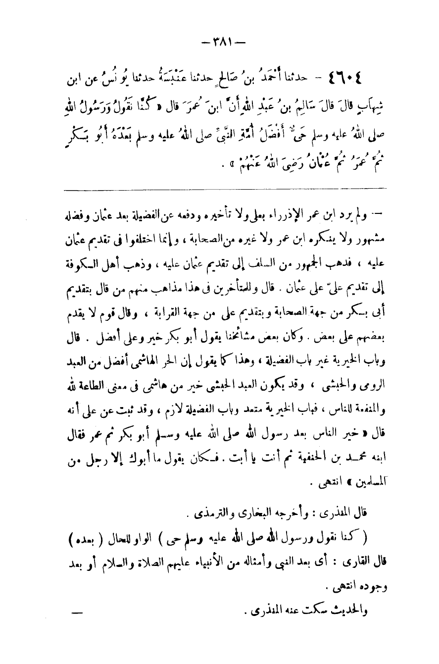 وَلَمْ يُرِدْ اِبْن عُمَر الِاذْدِرَاء بِعَلِيٍّ وَلَا تَأْخِيره وَدَفْعه عَنْ الْفَضِيلَة بَعْد عُثْمَان وَفَضْله مَشْهُور وَلَا يُنْكِرهُ اِبْن عُمَر وَلَا غَيْره مِنْ الصَّحَابَة ، وَإِنَّمَا اِخْتَلَفُوا فِي تَقْدِيم عُثْمَان عَلَيْهِ ، فَذَهَبَ الْجُمْهُور مِنْ السَّلَف إِلَى تَقْدِيم عُثْمَان عَلَيْهِ ، وَذَهَبَ أَهْل الْكُوفَة إِلَى تَقْدِيم عَلِيّ عَلَى عُثْمَان . قَالَ وَلِلْمُتَأَخِّرِينَ فِي هَذَا مَذَاهِب مِنْهُمْ مَنْ قَالَ بِتَقْدِيمِ أَبِي بَكْر مِنْ جِهَة الصَّحَابَة وَبِتَقْدِيمِ عَلِيّ مِنْ وَجِهَة الْقَرَابَة ، وَقَالَ قَوْم لَا يُقَدَّم بَعْضهمْ عَلَى بَعْض . وَكَانَ بَعْض مَشَايِخنَا يَقُول أَبُو بَكْر خَيْر وَعَلِيّ أَفْضَل . قَالَ وَبَاب الْخَيْرِيَّة غَيْر بَاب الْفَضِيلَة ، وَهَذَا كَمَا يَقُول إنَّ الْحُرّ الْهَاشِمِيّ أَفْضَل مِنْ الْعَبْد الرُّومِيّ وَالْحَبَشِيّ ، وَقَدْ يَكُون الْعَبْد الْحَبَشِيّ خَيْر مِنْ هَاشِمِيّ فِي مَعْنَى الطَّاعَة لِلَّهِ وَالْمَنْفَعَة لِلنَّاسِ ، فَبَاب الْخَيْرِيَّة مُتَعَدٍّ وَبَاب الْفَضِيلَة لَازِم ، وَقَدْ ثَبَتَ عَنْ عَلِيّ أَنَّهُ قَالَ " خَيْر النَّاس بَعْد رَسُول اللَّه صَلَّى اللَّه عَلَيْهِ وَسَلَّمَ أَبُو بَكْر ثُمَّ عُمَر فَقَالَ اِبْنه مُحَمَّد بْن الْحَنَفِيَّة ثُمَّ أَنْتَ يَا أَبَت . فَكَانَ يَقُول مَا أَبُوك إِلَّا رَجُل مِنْ الْمُسْلِمِينَ " اِنْتَهَى .