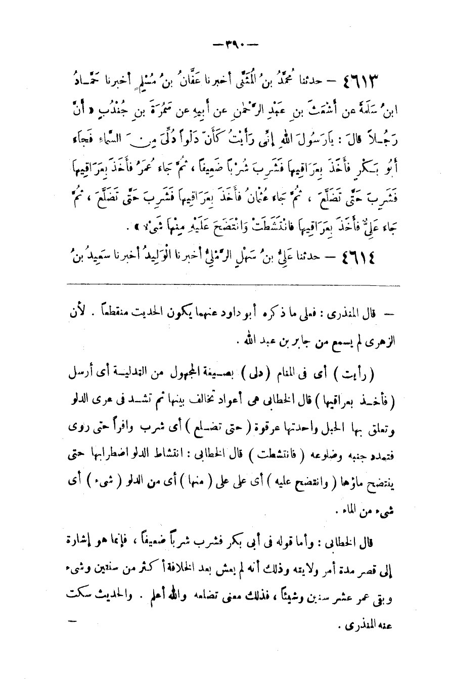 قَالَ الْخَطَّابِيُّ : وَأَمَّا قَوْله فِي أَبِي بَكْر فَشَرِبَ شُرْبًا ضَعِيفًا ، فَإِنَّمَا هُوَ إِشَارَة إِلَى قِصَر مُدَّة أَمْر وِلَايَته وَذَلِكَ أَنَّهُ لَمْ يَعِشْ بَعْد الْخِلَافَة أَكْثَر مِنْ سَنَتَيْنِ وَشَيْء وَبَقِيَ عُمَر عَشْر سِنِينَ وَشَيْئًا ، فَذَلِكَ مَعْنَى تَضَلُّعه وَاَللَّه أَعْلَم . الْحَدِيث سَكَتَ عَنْهُ الْمُنْذِرِيُّ.@