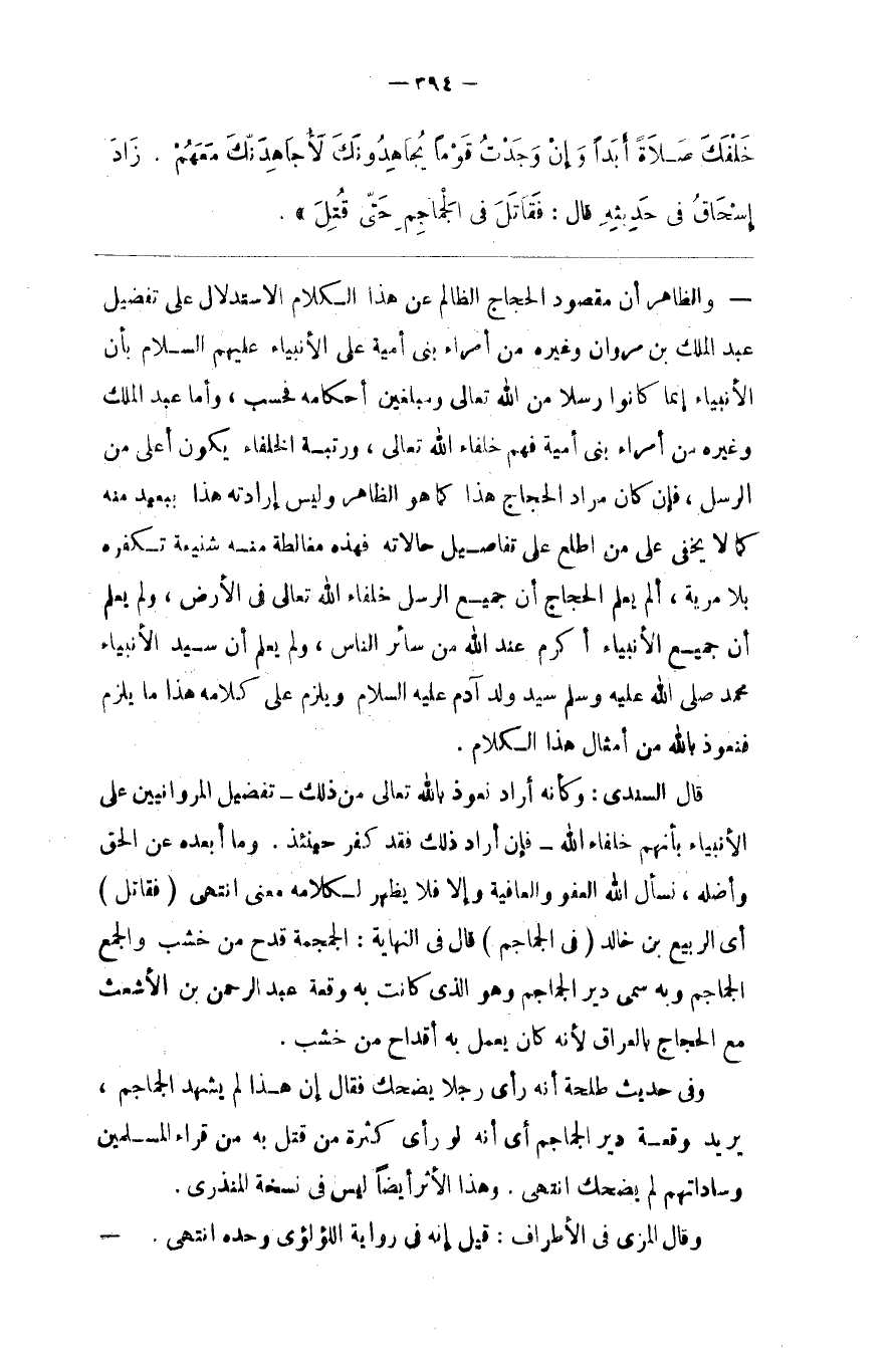 وَالظَّاهِر أَنَّ مَقْصُود الْحَجَّاج الظَّالِم عَنْ هَذَا الْكَلَام الِاسْتِدْلَال عَلَى تَفْضِيل عَبْد الْمَلِك بْن مَرْوَان وَغَيْره مِنْ أُمَرَاء بَنِي أُمَيَّة عَلَى الْأَنْبِيَاء عَلَيْهِمْ السَّلَام بِأَنَّ الْأَنْبِيَاء إِنَّمَا كَانُوا رُسُلًا مِنْ اللَّه تَعَالَى وَمُبَلِّغِينَ أَحْكَامه فَحَسْب ، وَأَمَّا عَبْد الْمَلِك وَغَيْره مِنْ أُمَرَاء بَنِي أُمَيَّة فَهُمْ خُلَفَاء اللَّه تَعَالَى ، وَرُتْبَة الْخُلَفَاء يَكُون أَعْلَى مِنْ الرُّسُل ، فَإِنْ كَانَ مُرَاد الْحَجَّاج هَذَا كَمَا هُوَ الظَّاهِر وَلَيْسَ إِرَادَته هَذَا بِبَعِيدٍ مِنْهُ كَمَا لَا يَخْفَى عَلَى مَنْ اِطَّلَعَ عَلَى تَفَاصِيل حَالَاته فَهَذِهِ مُغَالَطَة مِنْهُ شَنِيعَة تُكَفِّرهُ بِلَا مِرْيَة ، أَلَمْ يَعْلَم الْحَجَّاج أَنَّ جَمِيع الرُّسُل خُلَفَاء اللَّه تَعَالَى فِي الْأَرْض ، وَلَمْ يَعْلَم أَنَّ جَمِيع الْأَنْبِيَاء أَكْرَم عِنْد اللَّه مِنْ سَائِر النَّاس وَلَمْ يَعْلَم أَنَّ سَيِّد الْأَنْبِيَاء مُحَمَّد صَلَّى اللَّه عَلَيْهِ وَسَلَّمَ سَيِّد وَلَد آدَم عَلَيْهِ السَّلَام وَيَلْزَم عَلَى كَلَامه هَذَا مَا يَلْزَم فَنَعُوذ بِاَللَّهِ مِنْ أَمْثَال هَذَا الْكَلَام.