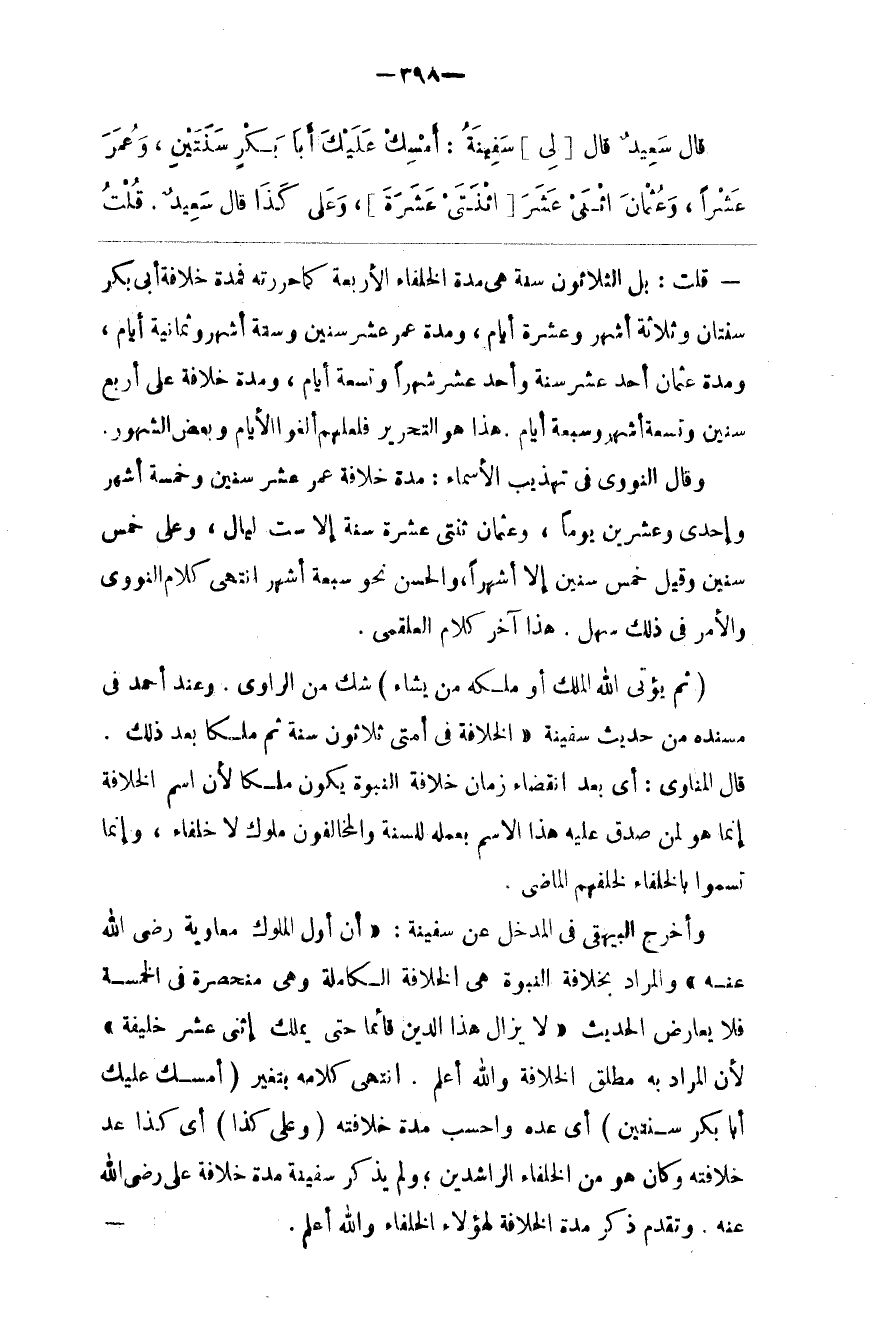 قُلْت : بَلْ الثَّلَاثُونَ سَنَة هِيَ مُدَّة الْخُلَفَاء الْأَرْبَعَة كَمَا حَرَّرْته فَمُدَّة خِلَافَة أَبِي بَكْر سَنَتَانِ وَثَلَاثَة أَشْهُر وَعَشْرَة أَيَّام ، وَمُدَّة عُمَر عَشْر سِنِينَ وَسِتَّة أَشْهُر وَثَمَانِيَة أَيَّام ، وَمُدَّة عُثْمَان أَحَد عَشَرَ سَنَة وَأَحَد عَشَرَ شَهْرًا وَتِسْعَة أَيَّام وَمُدَّة خِلَافَة عَلِيّ أَرْبَع سِنِينَ وَتِسْعَة أَشْهُر وَسَبْعَة أَيَّام . هَذَا هُوَ التَّحْرِير فَلَعَلَّهُمْ أَلْغَوْا الْأَيَّام وَبَعْض الشُّهُور .