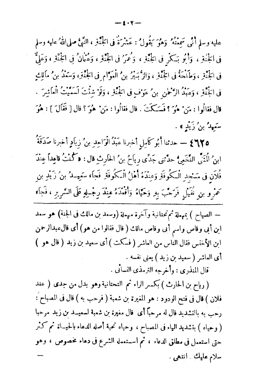 : قَالَ فِي الْمِصْبَاح : رَحَّبَ بِهِ بِالتَّشْدِيدِ قَالَ لَهُ مَرْحَبًا أَيْ قَالَ مُغِيرَة بْن شُعْبَة لِسَعِيدِ بْن زَيْد مَرْحَبًا