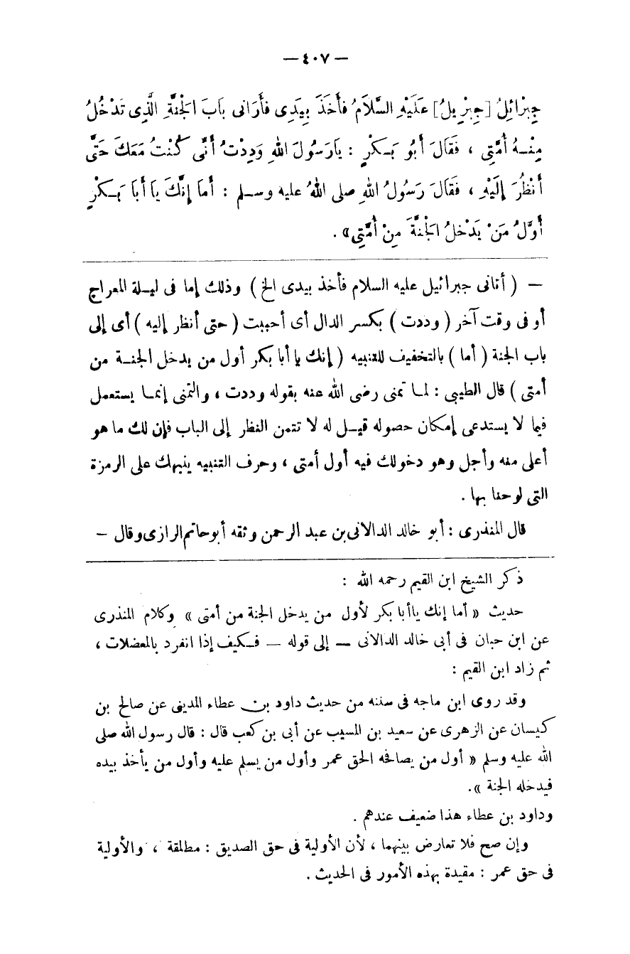 ذكر الشيخ ابن القيم رحمه الله حديث أما إنك يا أبا بكر لأول من يدخل الجنة من أمتي وكلام المنذري عن ابن حبان في أبي خالد الدالاني إلى قوله فكيف إذا انفرد بالمعضلات ثم زاد ابن القيم وقد روى ابن ماجه في سننه من حديث داود بن عطاء المديني عن صالح بن كيسان عن الزهري عن سعيد بن المسيب عن أبي بن كعب قال قال رسول الله صلى الله عليه و سلم أول من يصافحه الحق عمر وأول من يسلم عليه وأول من يأخذ بيده فيدخله الجنة